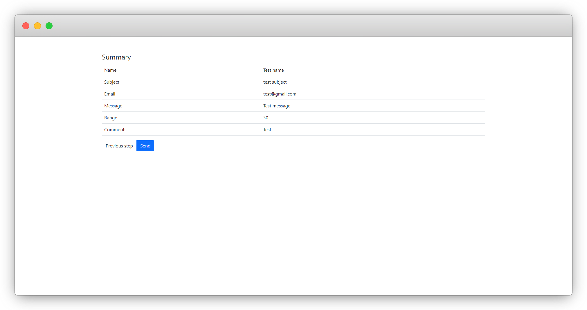 3. Save the form open the front-end and fill up the form again. When you click the “Next Step” in step 2, you will get the summary like the screenshot below: