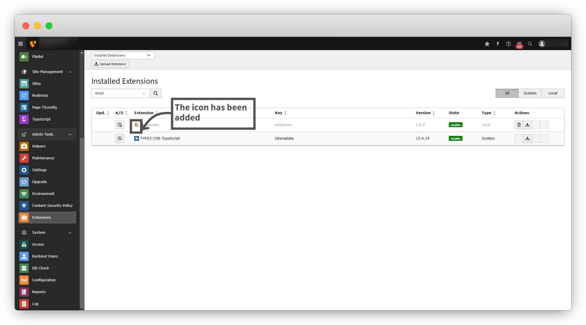 1. To add the icon for the extension, you just need to upload the icon with the name “Extension.png” and upload the icon to employee/Resources/Public/Icons in employee extension. You should be punctual towards the name of icon.