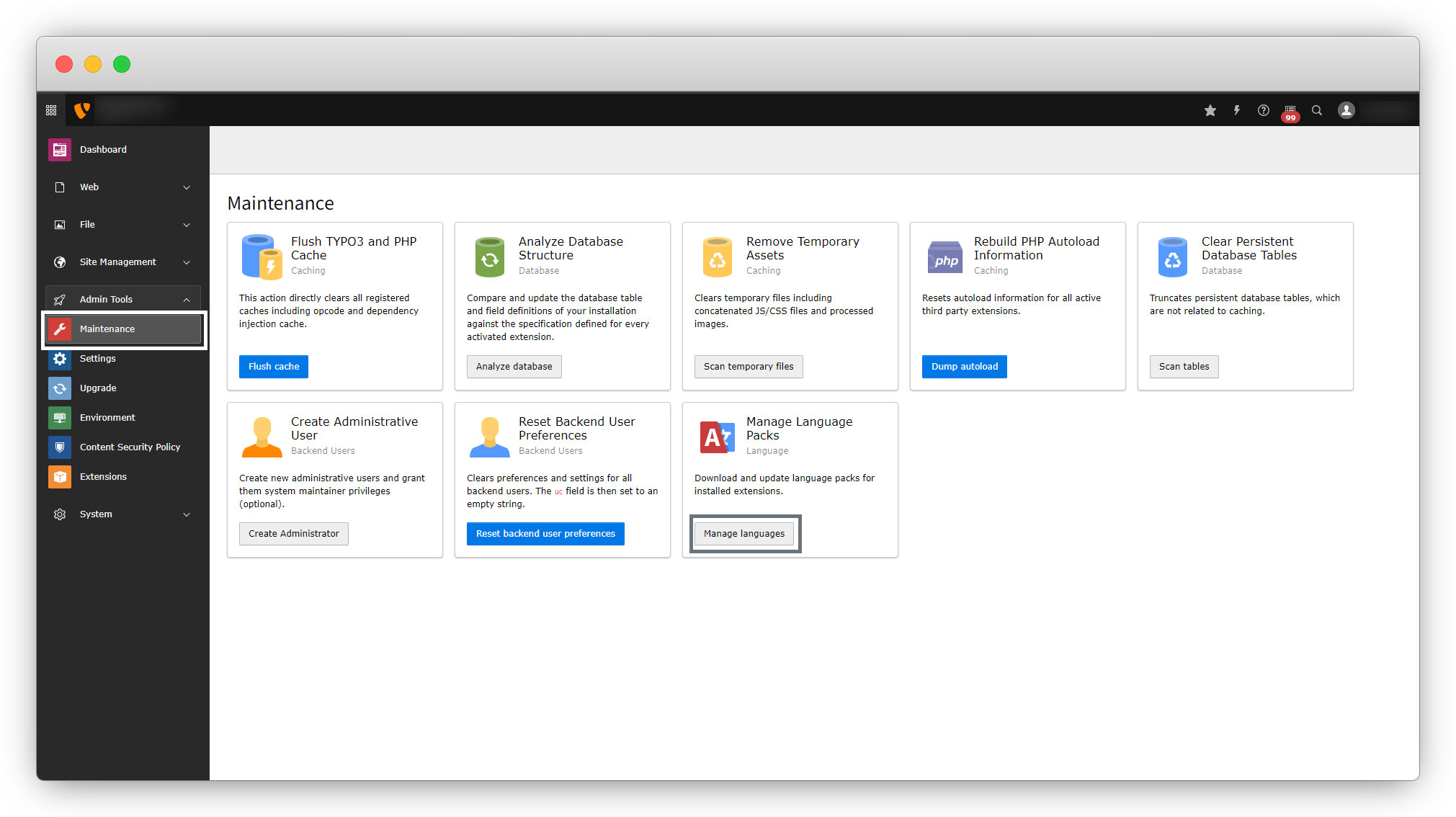 1. Go to Admin tools > Maintenance > Manage Language Packs and click the button “Manage languages” as seen in the screenshot below.