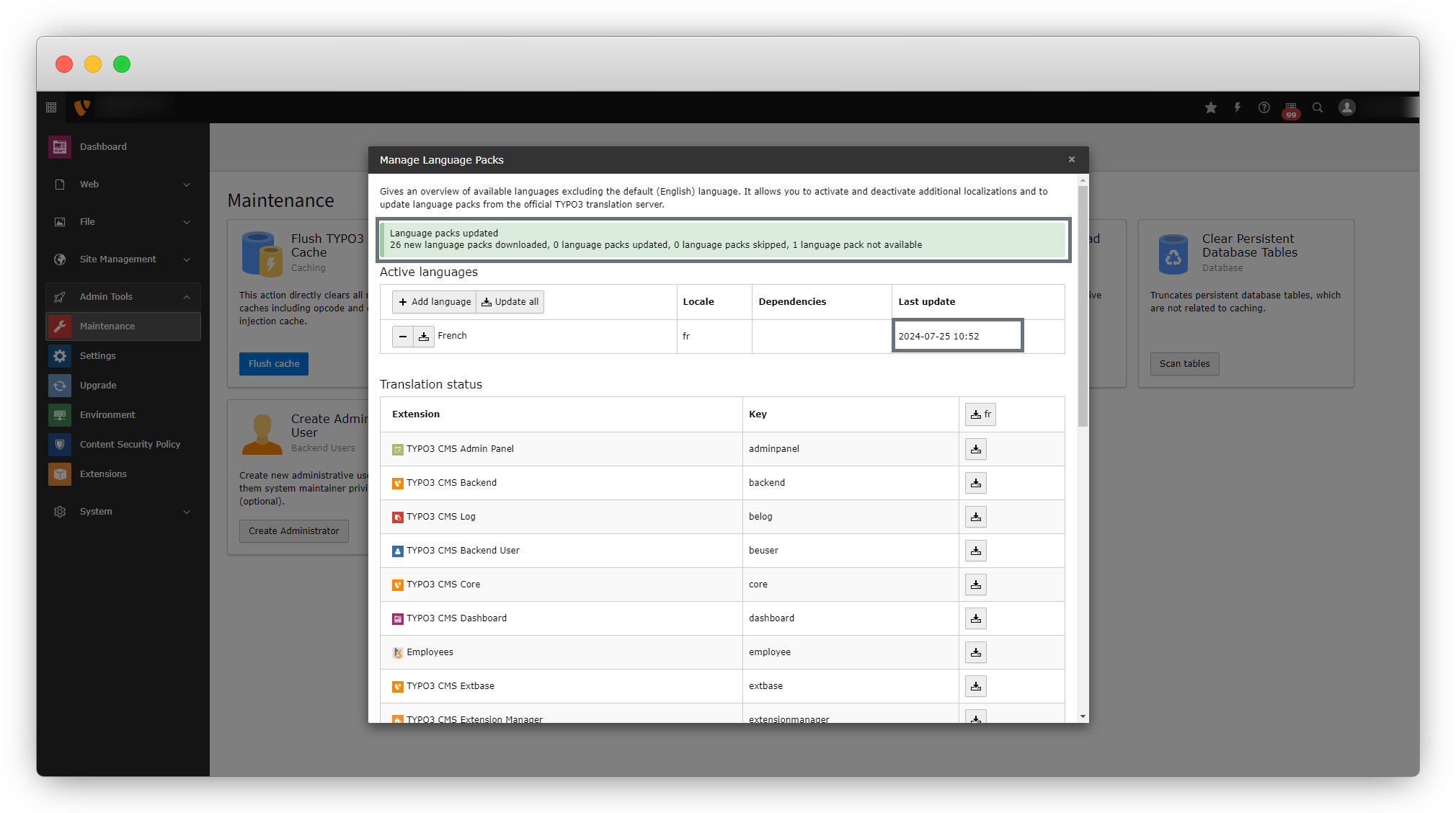 7. After downloading the language, you will see the message and also the date in the “Last update” column.