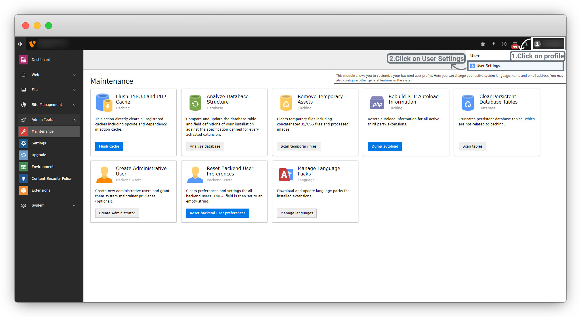 1. To change the language of the admin panel, go to the profile and click on the user settings button as seen in the screenshot below.