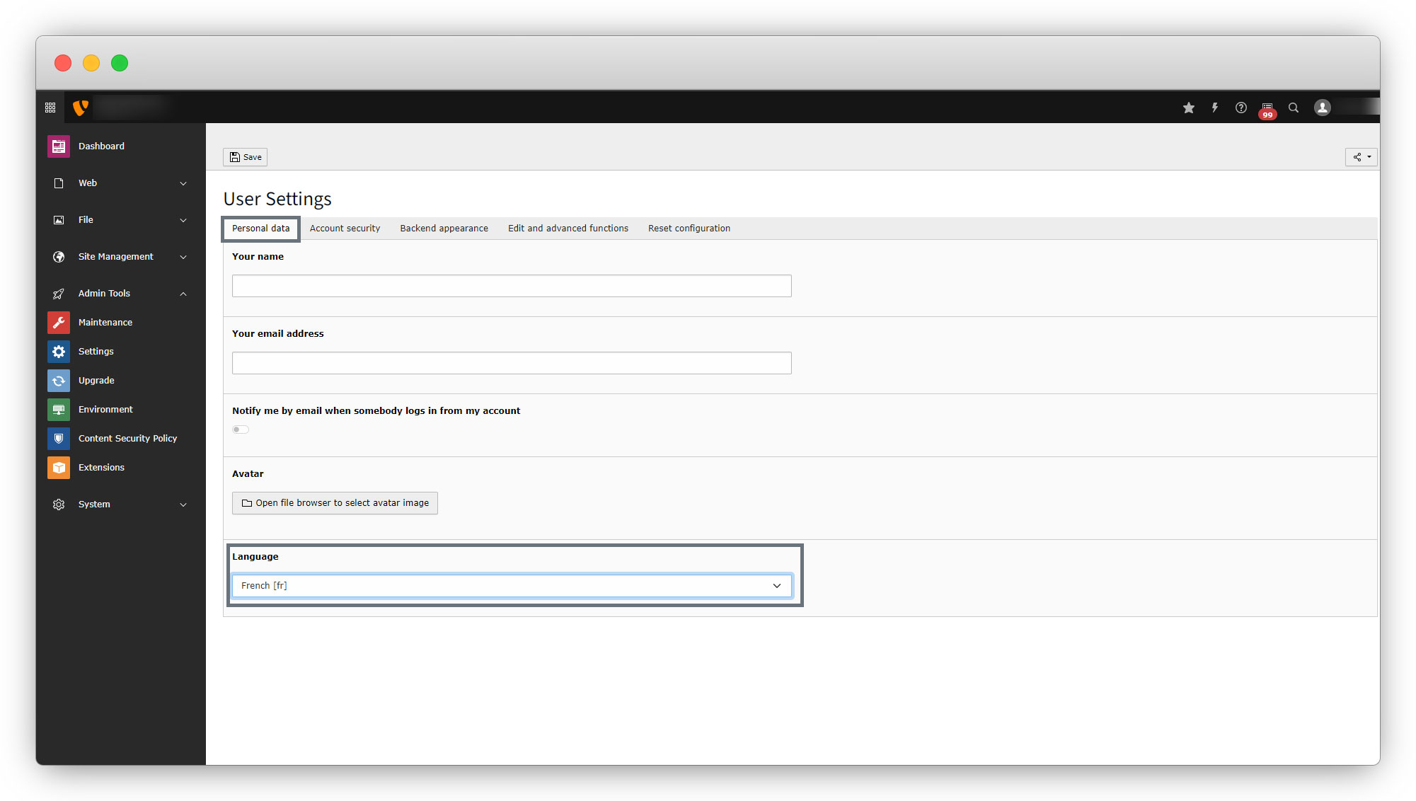 2. In user settings, there is an option to change the language in the “Personal data” tab, select the French language there and save the settings by clicking on the save button.
