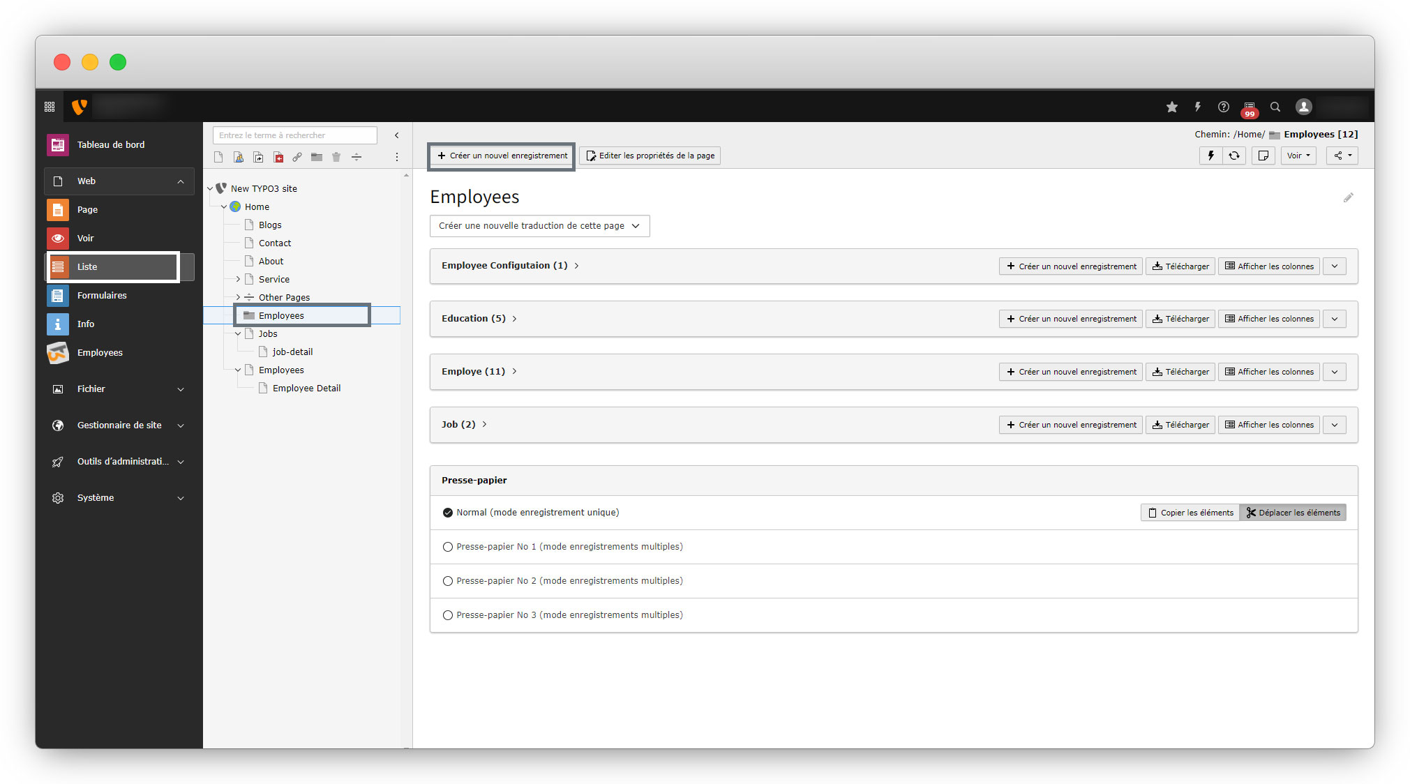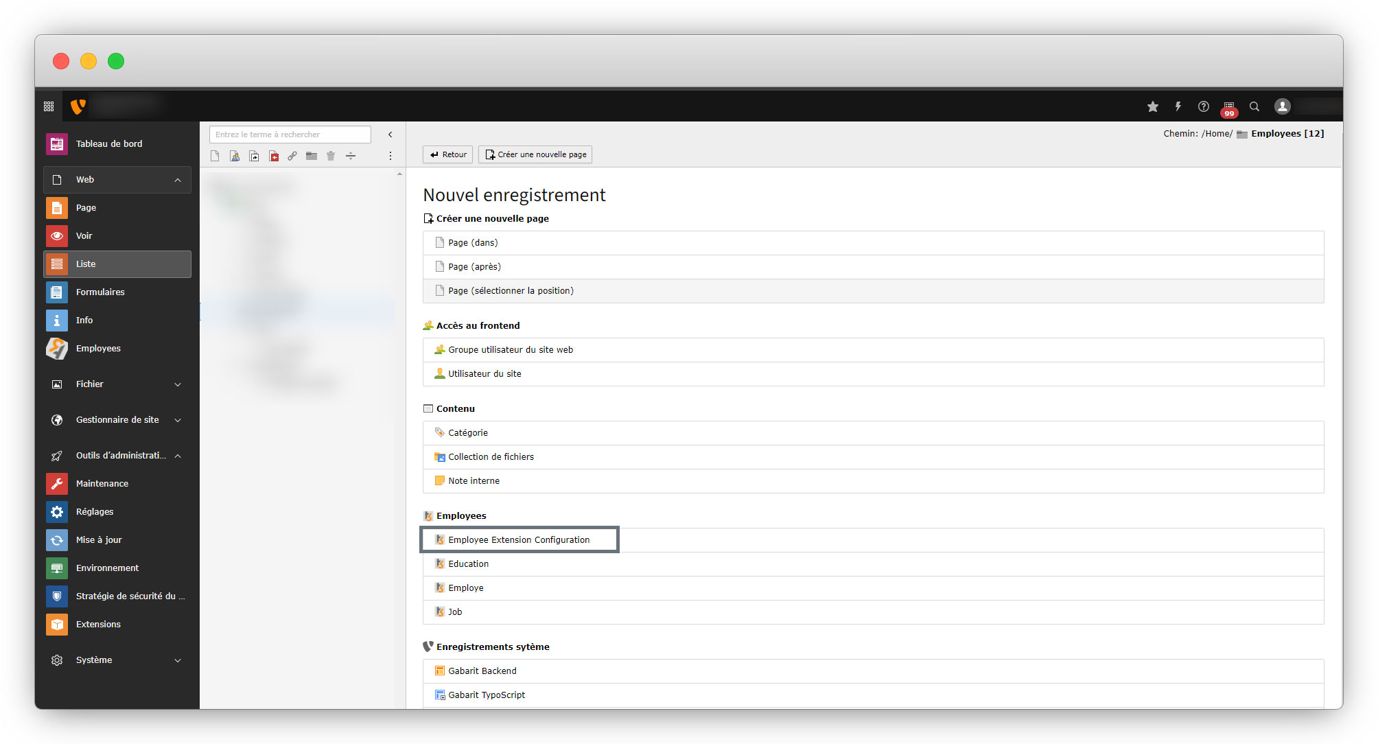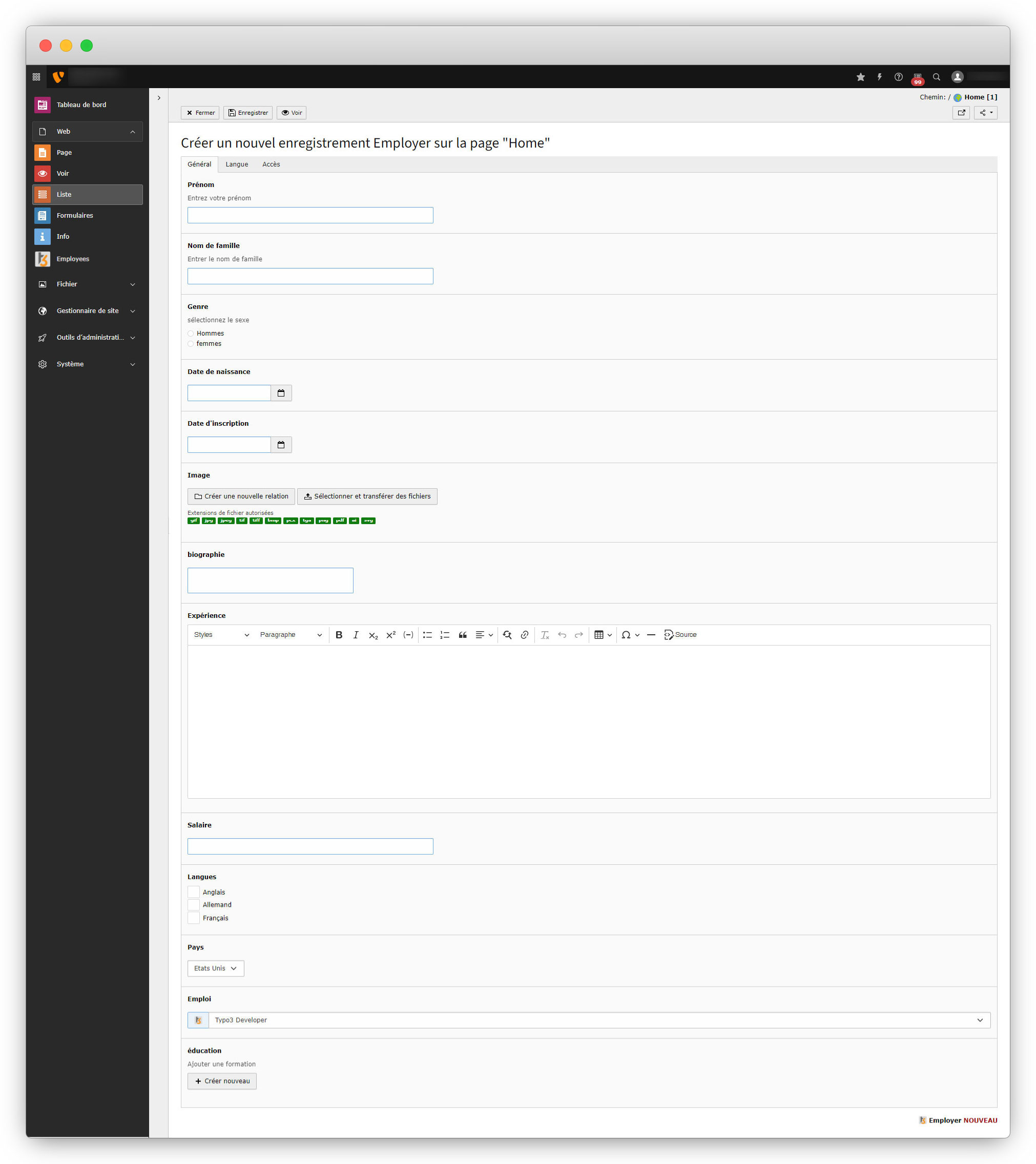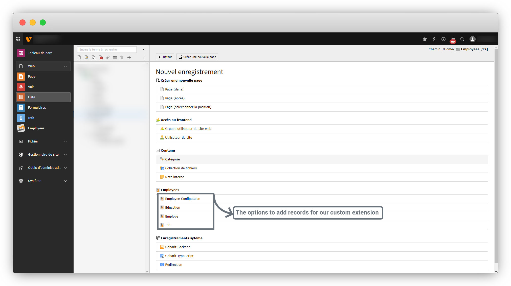 4. As you can see in the above screenshot, the options to add the records are displayed in the English language while the currently selected language is French. So to show these options in French, create the language files in employee/Resources/Private/Language folder.