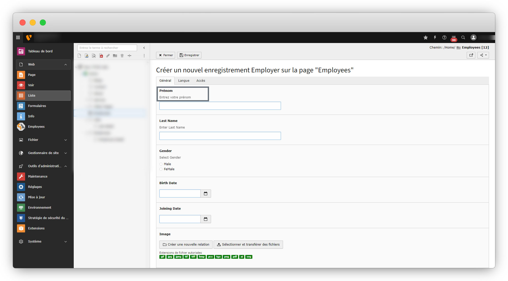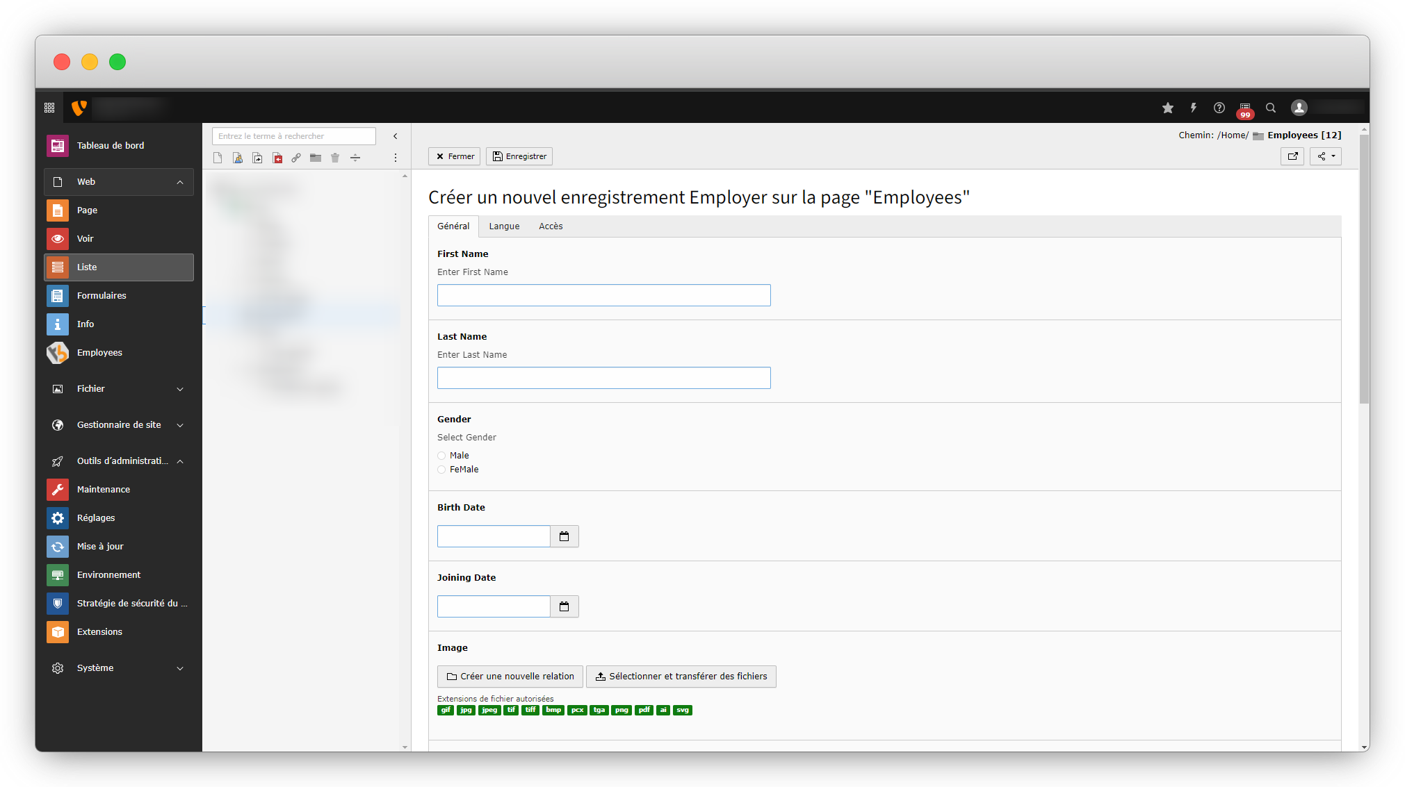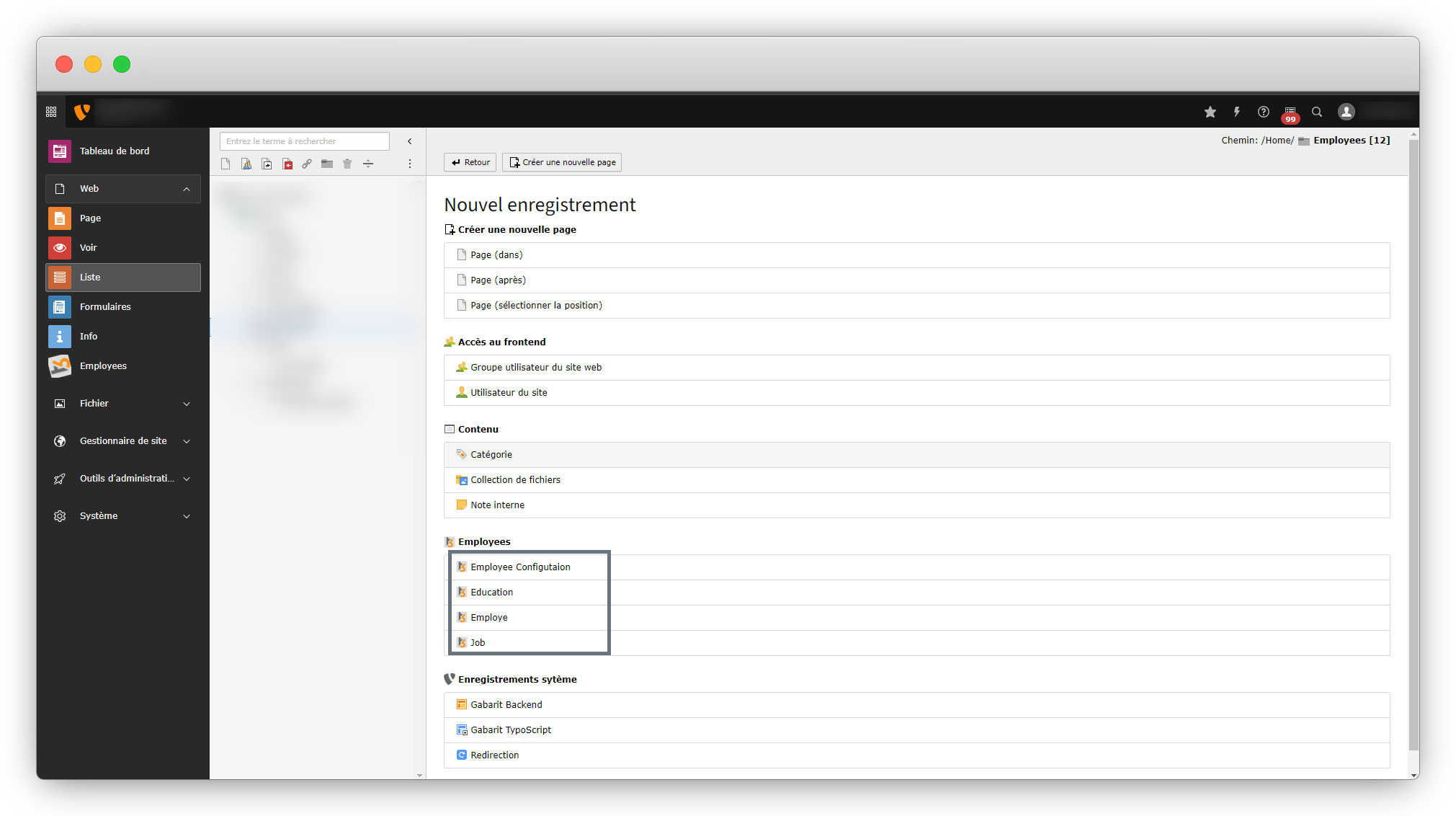 2. Go to the List but here the language is French for now so go to the “Liste” > select the folder “Employees” or select whatever folder you have stored your records in > then click the button “Créer un nouvel enregistrement” to create a new record.