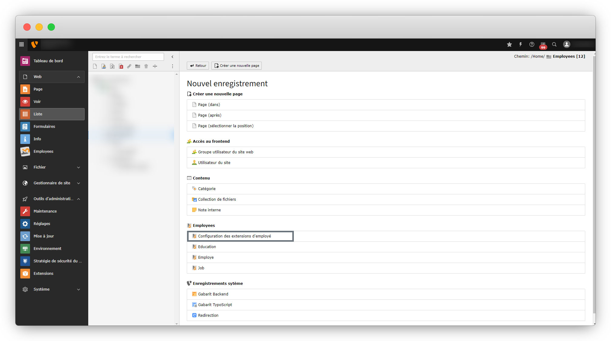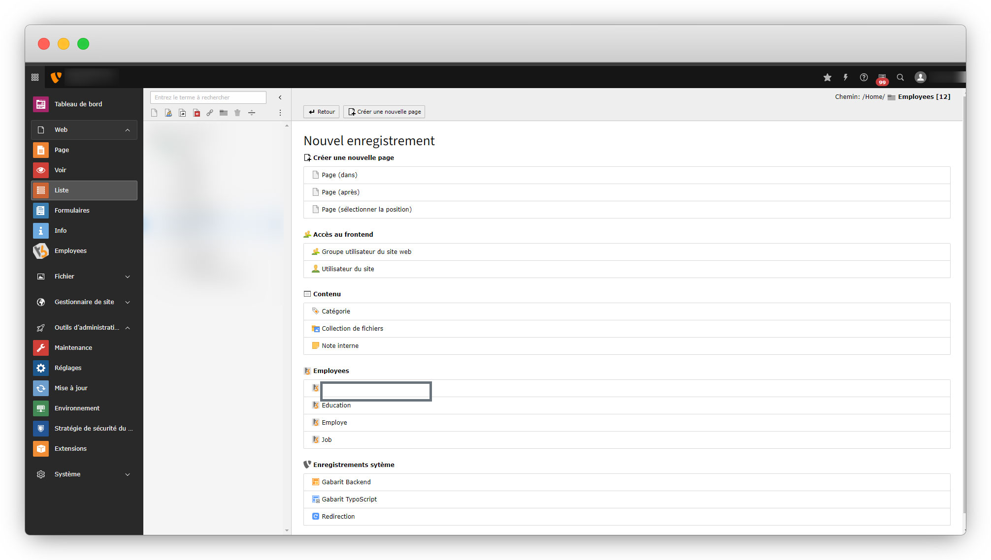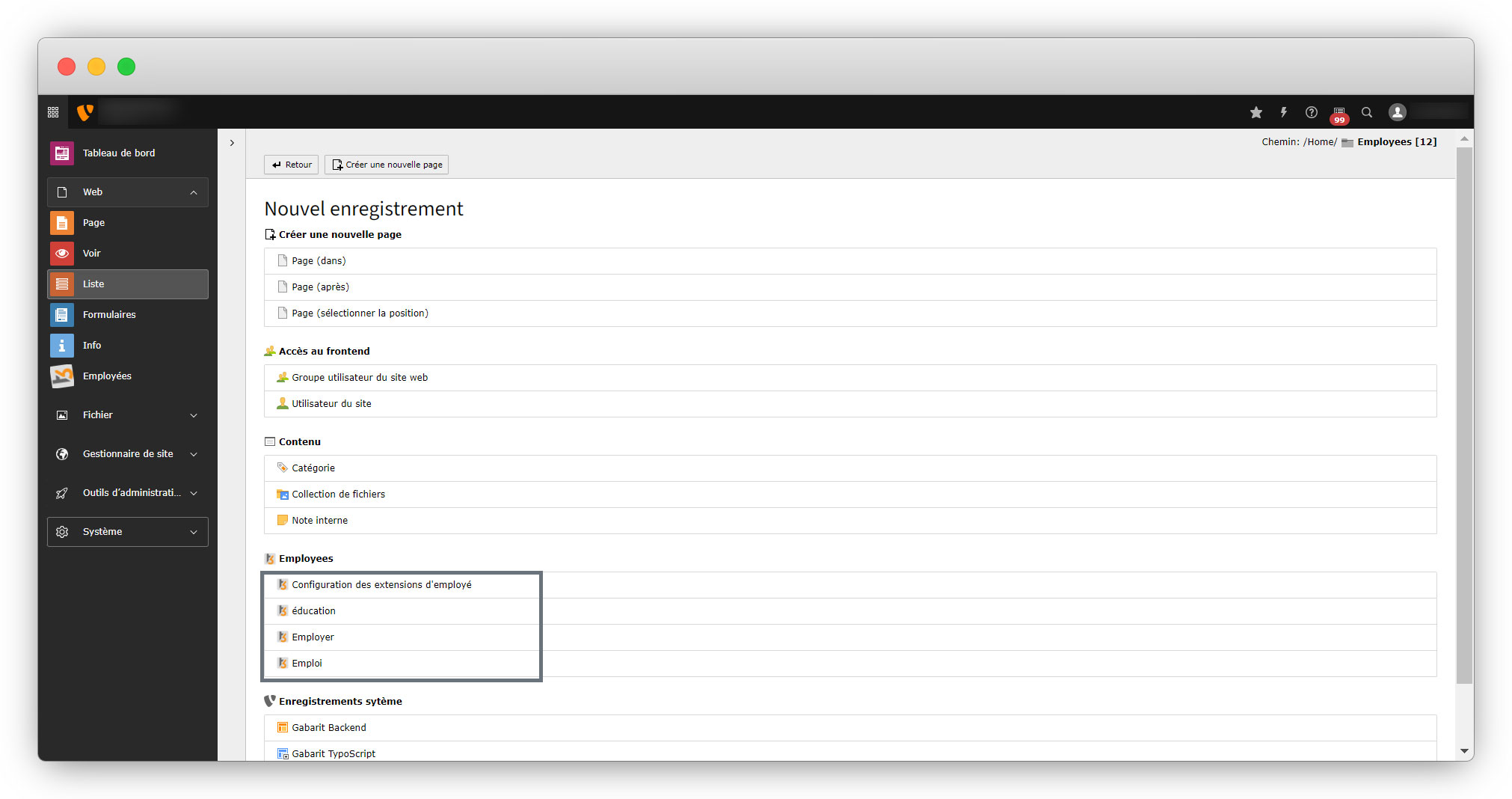 2. Go to the List but here the language is French for now so go to the “Liste” > select the folder “Employees” or select whatever folder you have stored your records in > then click the button “Créer un nouvel enregistrement” to create a new record.