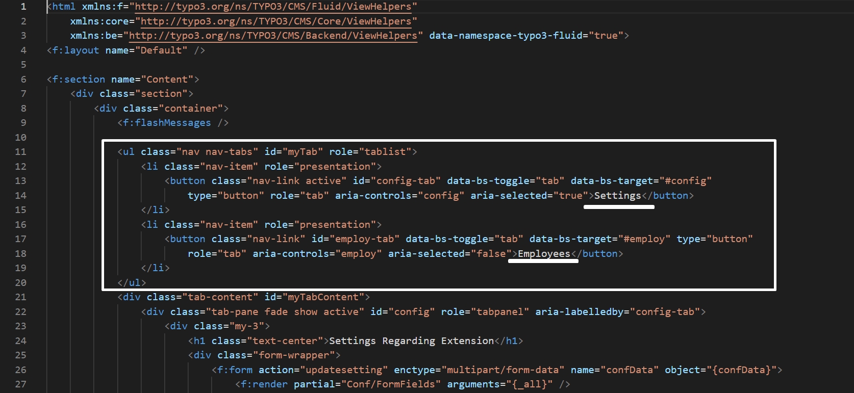 9.6. As you can see in the above screenshot, the title is not rendering, this is an issue that is occurring because we have added the key “conf” in TCA file’s title but we didn’t define it in the “locallang_employee.xlf” file. Let’s define the key conf. Add the code below in the locallang_employee.xlf file.