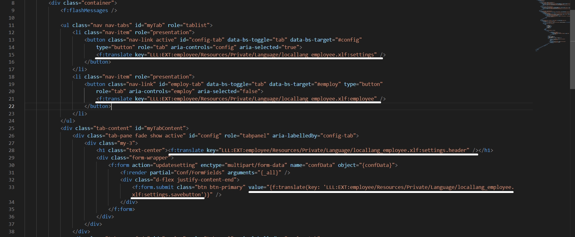 3.5. After updating the flexform, update the file employeeResourcesPrivateLanguagelocallang_employee.xlf to add the key and text for the above title. Add the code given below to the file employeeResourcesPrivateLanguagelocallang_employee.xlf