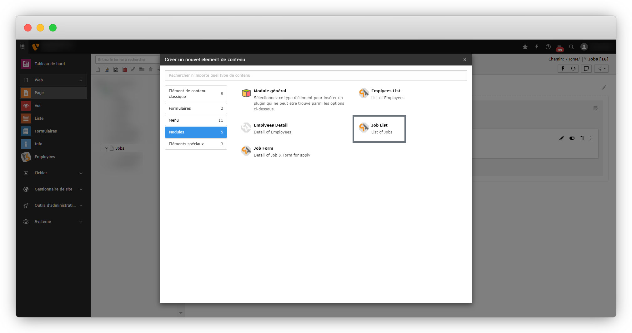 1.1. When you go on any page and click on the button “+content”, you will see a wizard, go to plugins (Modules in French) and you will see all the front-end plugins are rendering in English only as seen in the screenshot below.