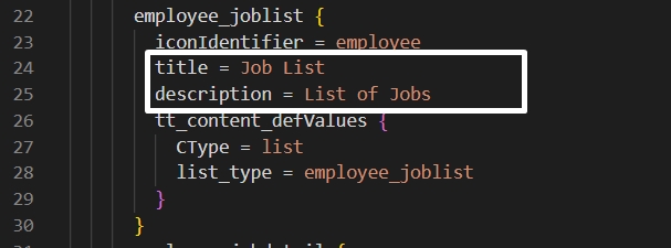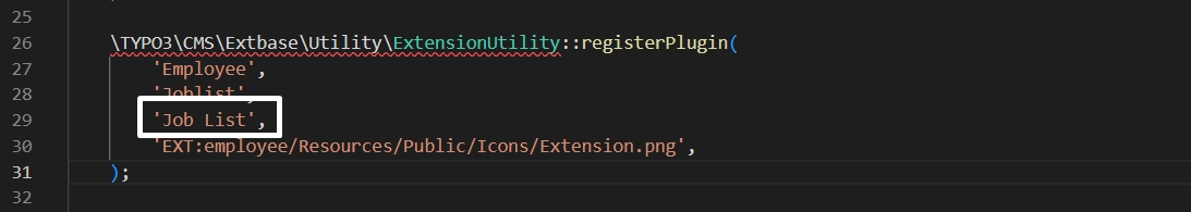 2.3. Update the highlighted title “Job List” with the line “LLL:EXT:employee/Resources/Private/Language/locallang_employee.xlf:employee_joblist_title“, the full code for the Job List plugin is below