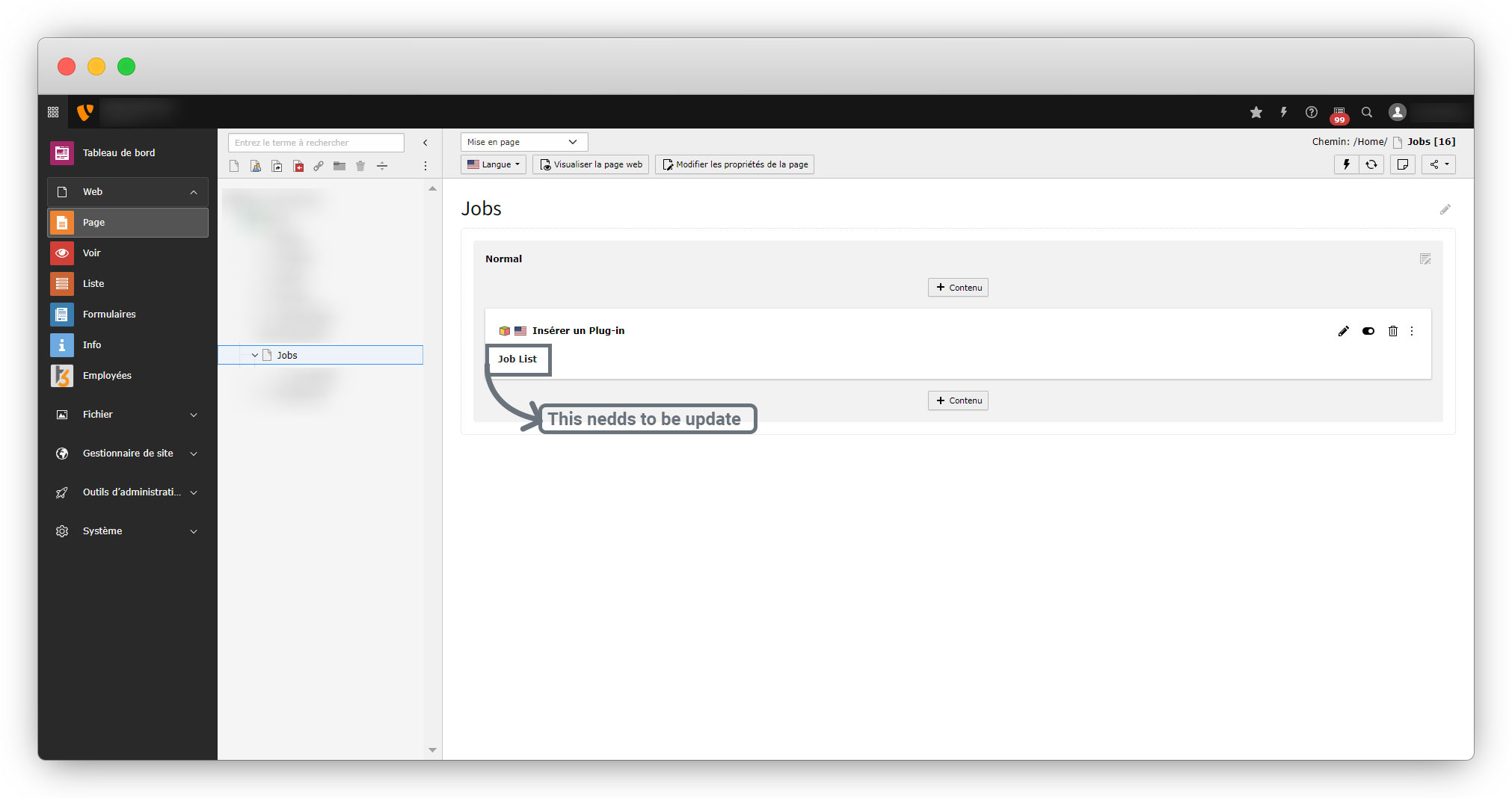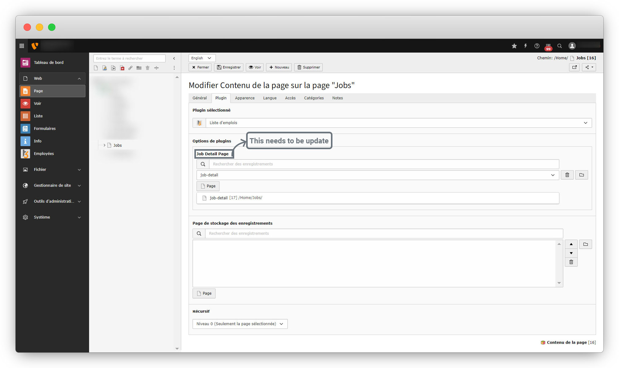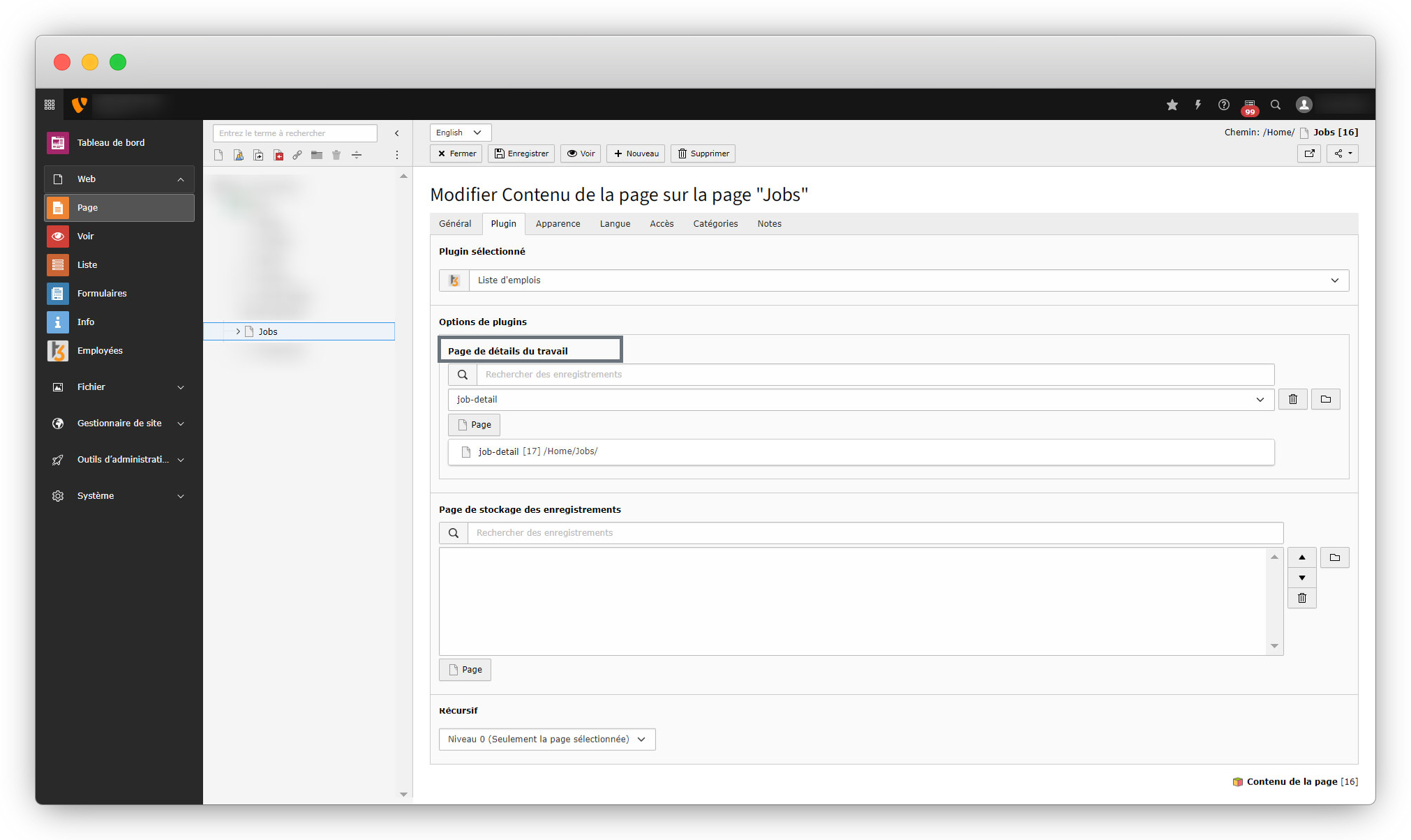 3.1. After adding the plugin when you click on the edit icon to open it, go to the plugin tab to select the detail page for the job and you will see the title in English while the selected language is French as you can see in the screenshot below