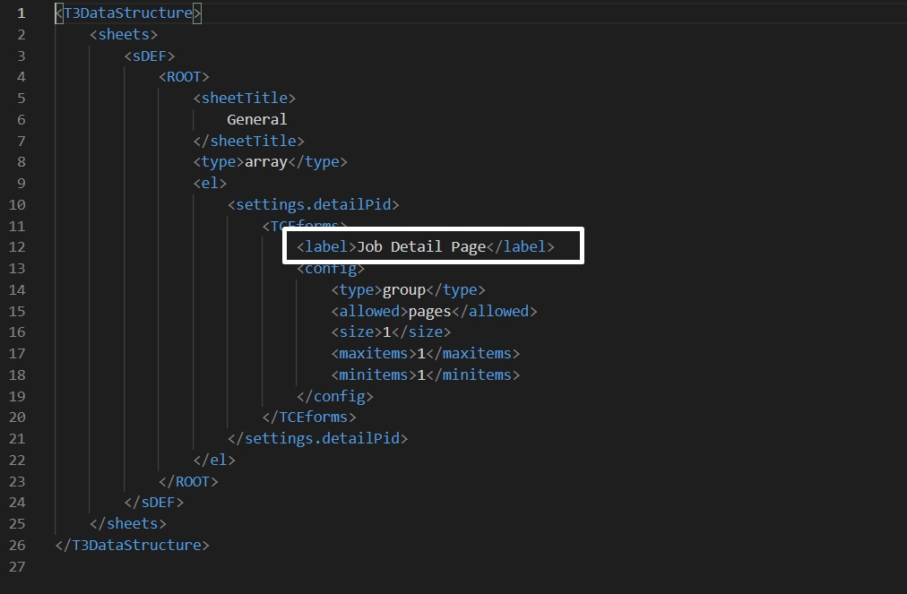 3.2. What you can see in the above screenshot is the part of a flexform. Let’s update the flexform for the job configs to translate the highlighted title.