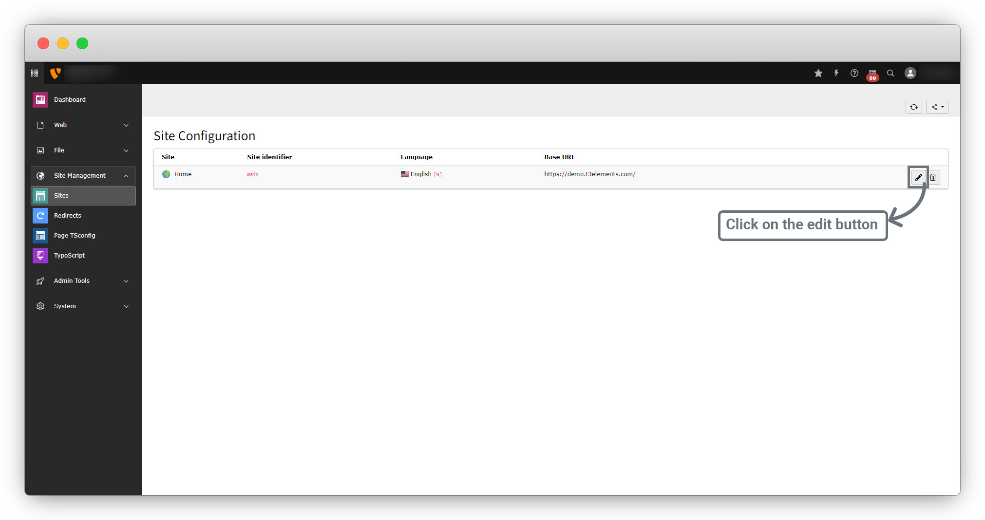 1. To add the multi-language in front-end go to the Site Management > Sites and you will see the screen as seen in the screenshot below, then click on the edit button: