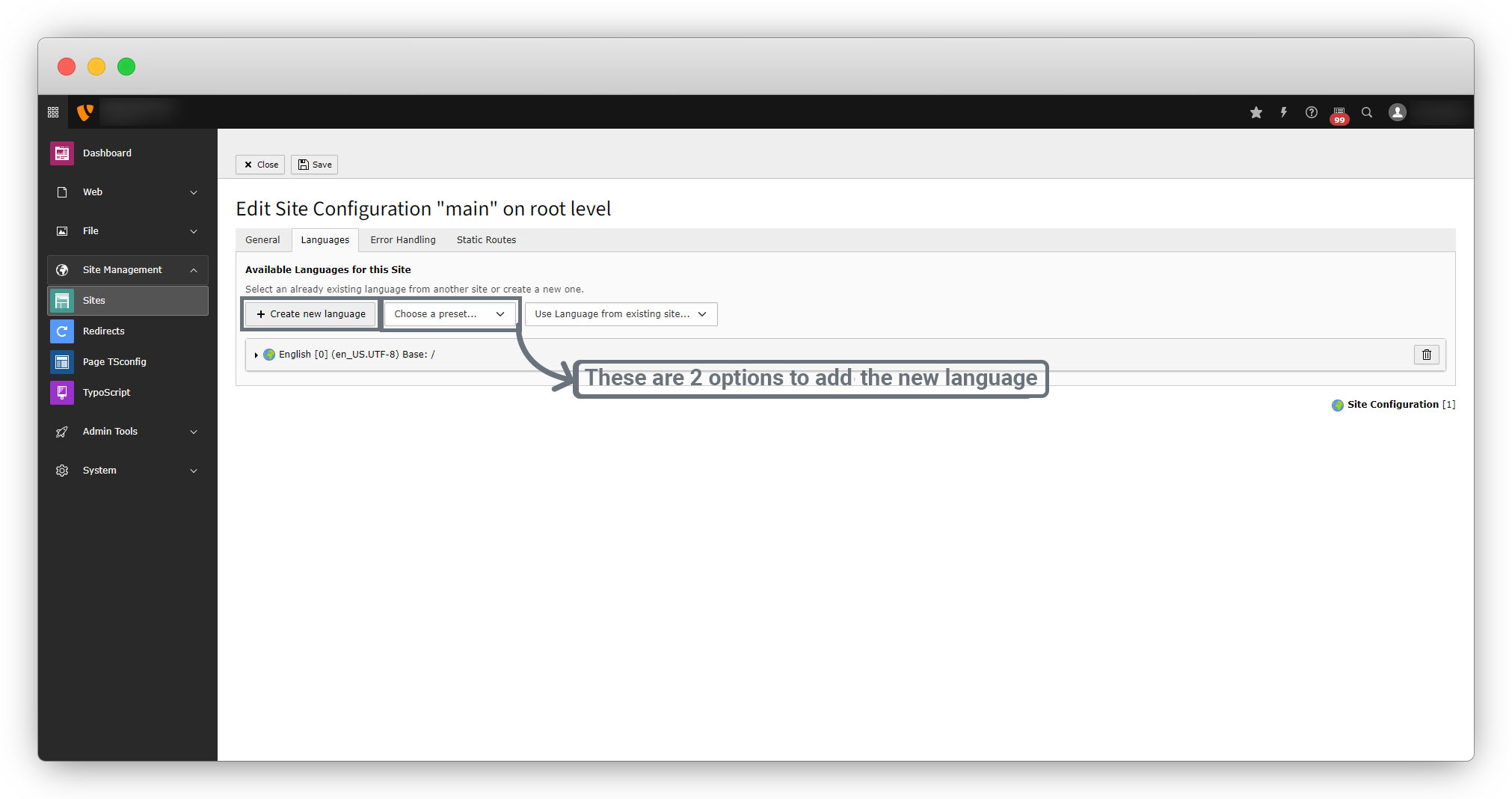 2. After clicking on the edit button, you will see the below screen. There are 2 options you can use to add the new language and those options are i) Create new language and ii) Choose a preset….
