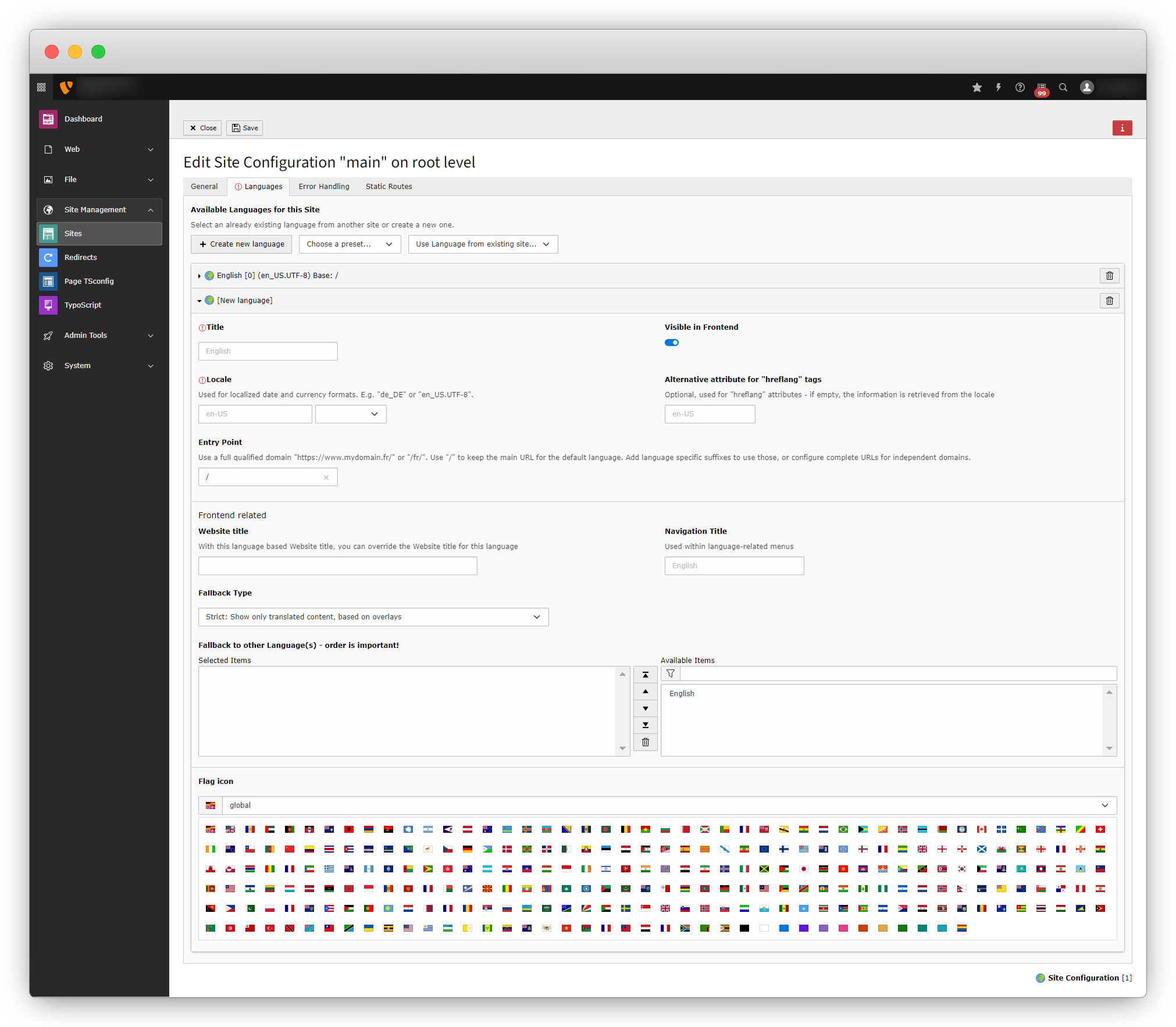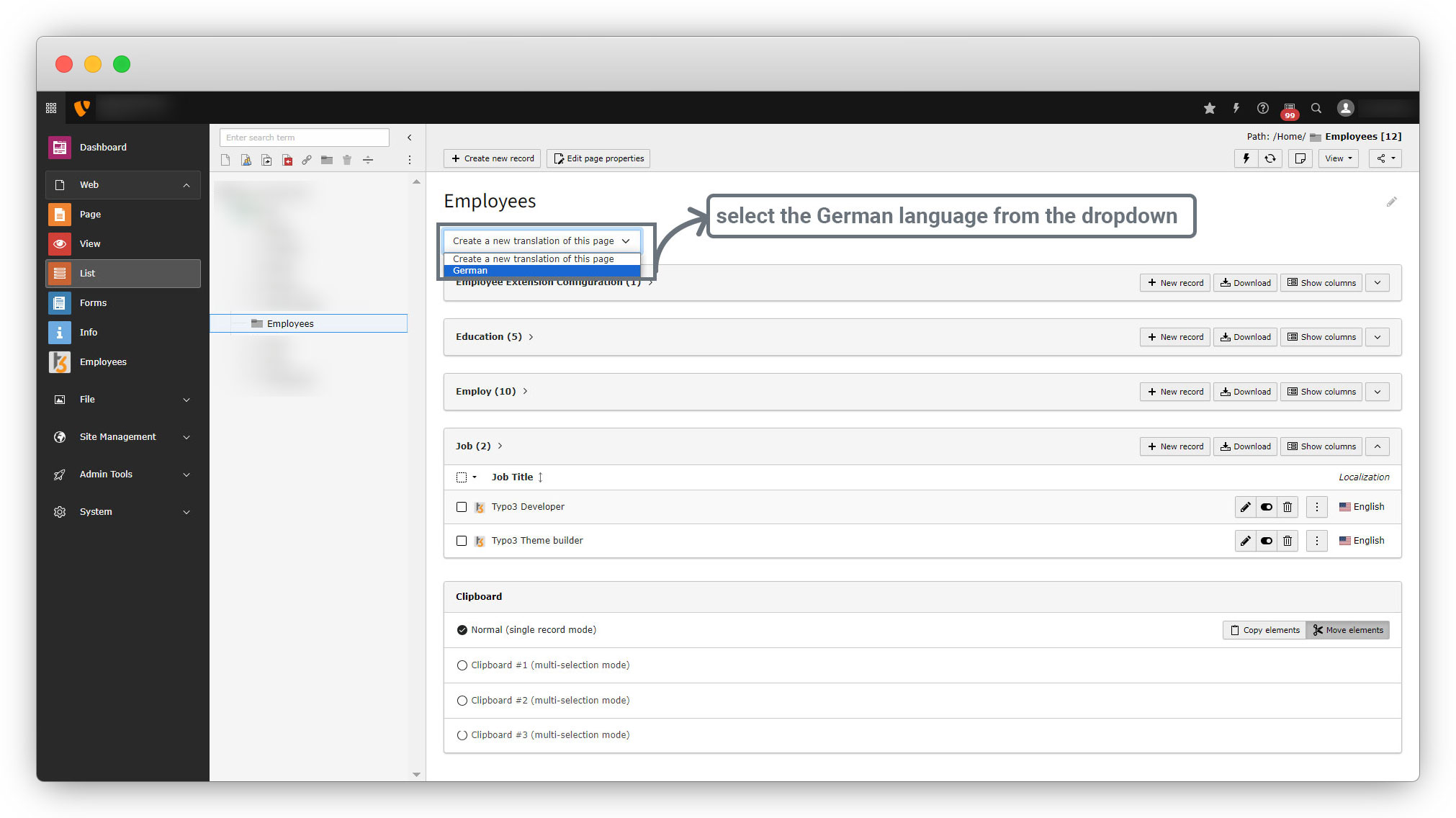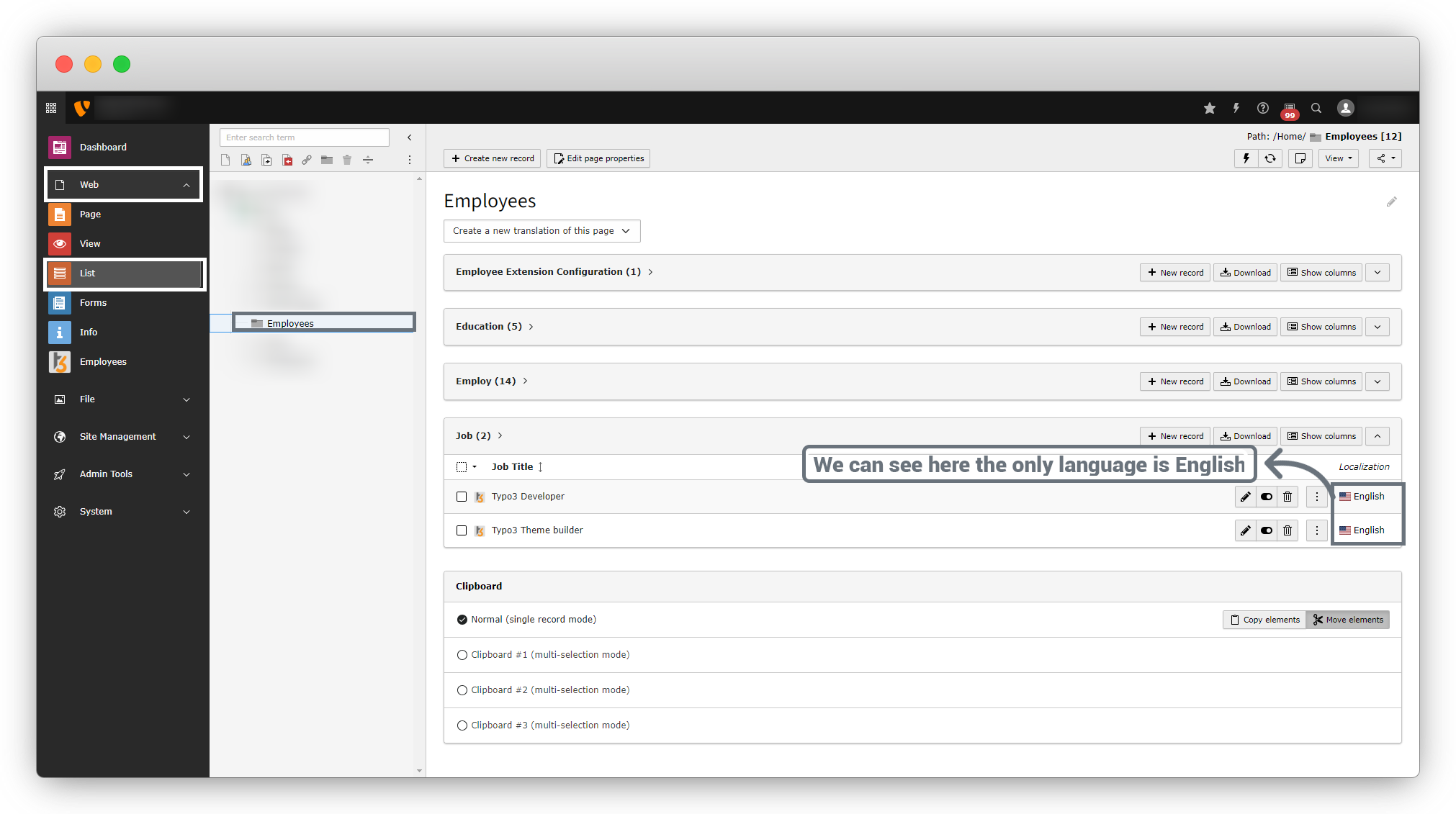 The default language for the front-end in TYPO3 is English. First, update the language in the back-end from French to English so it can be easier to understand how to add multi-language for the front-end. You can check in the “Set Backend Language” section to learn how to select the English language.