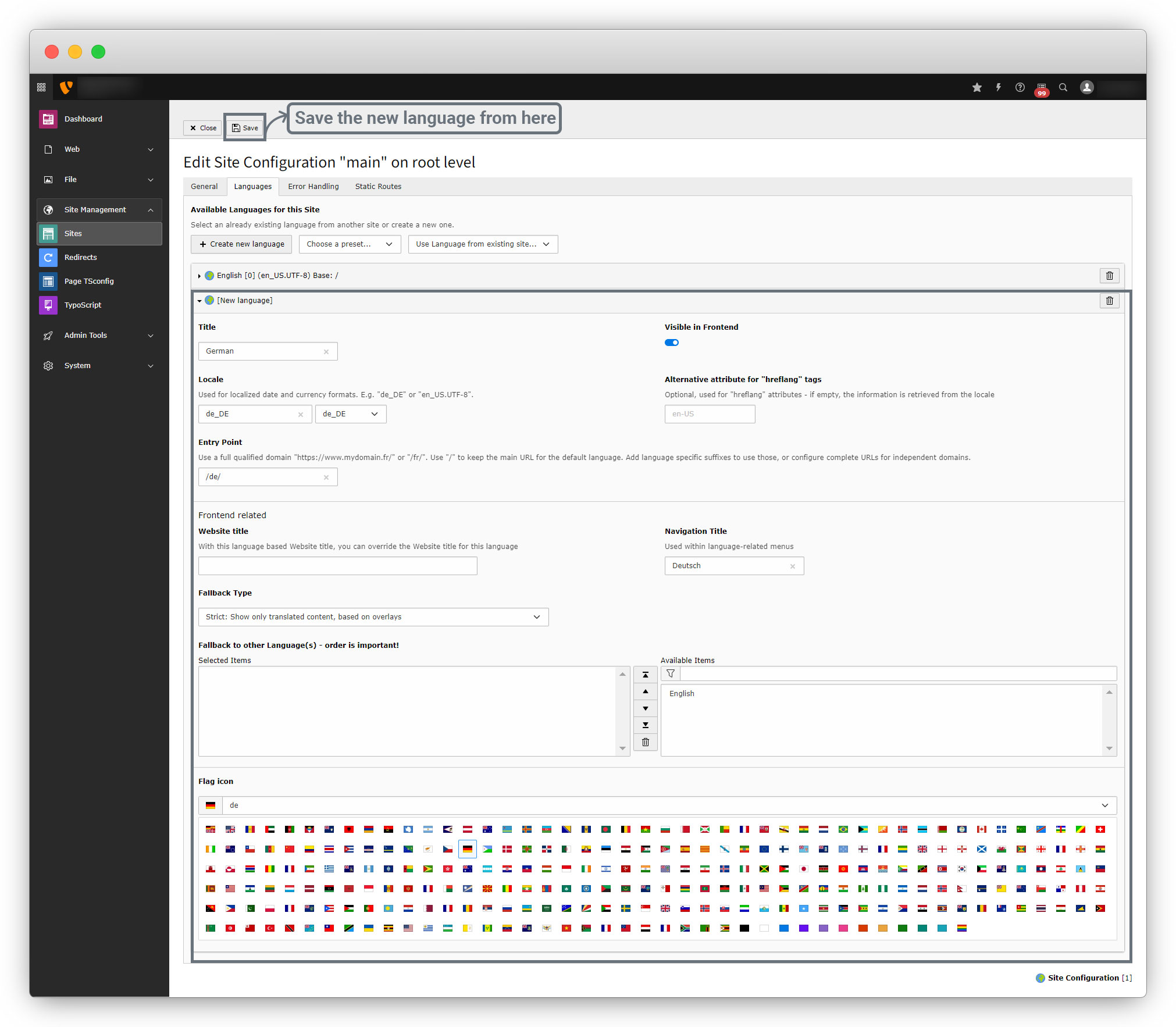 9. Set the values for all the fields for the German language here (or for whatever language you want to add) and save the page.