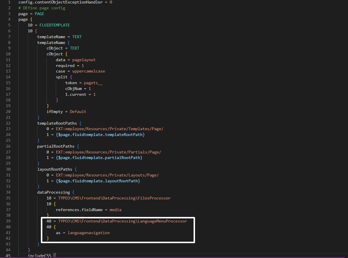 5. Below is the screenshot of the employeeConfigurationTypoScriptsetup.typoscript file after adding the above code under “dataProcessing”.