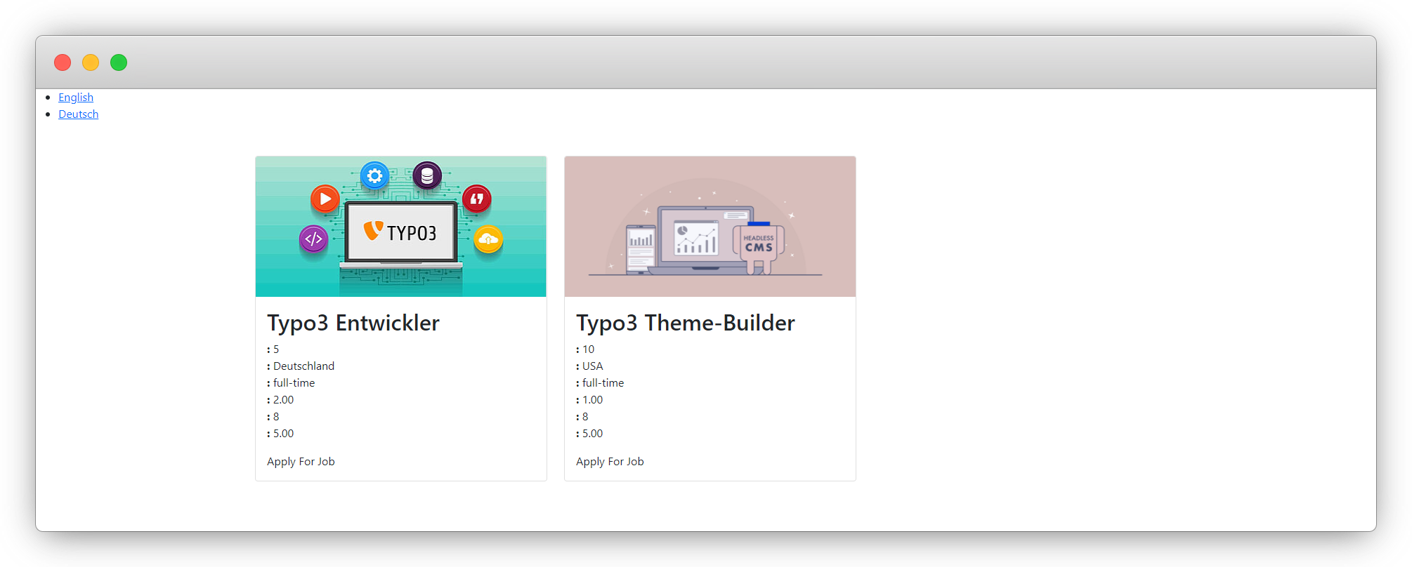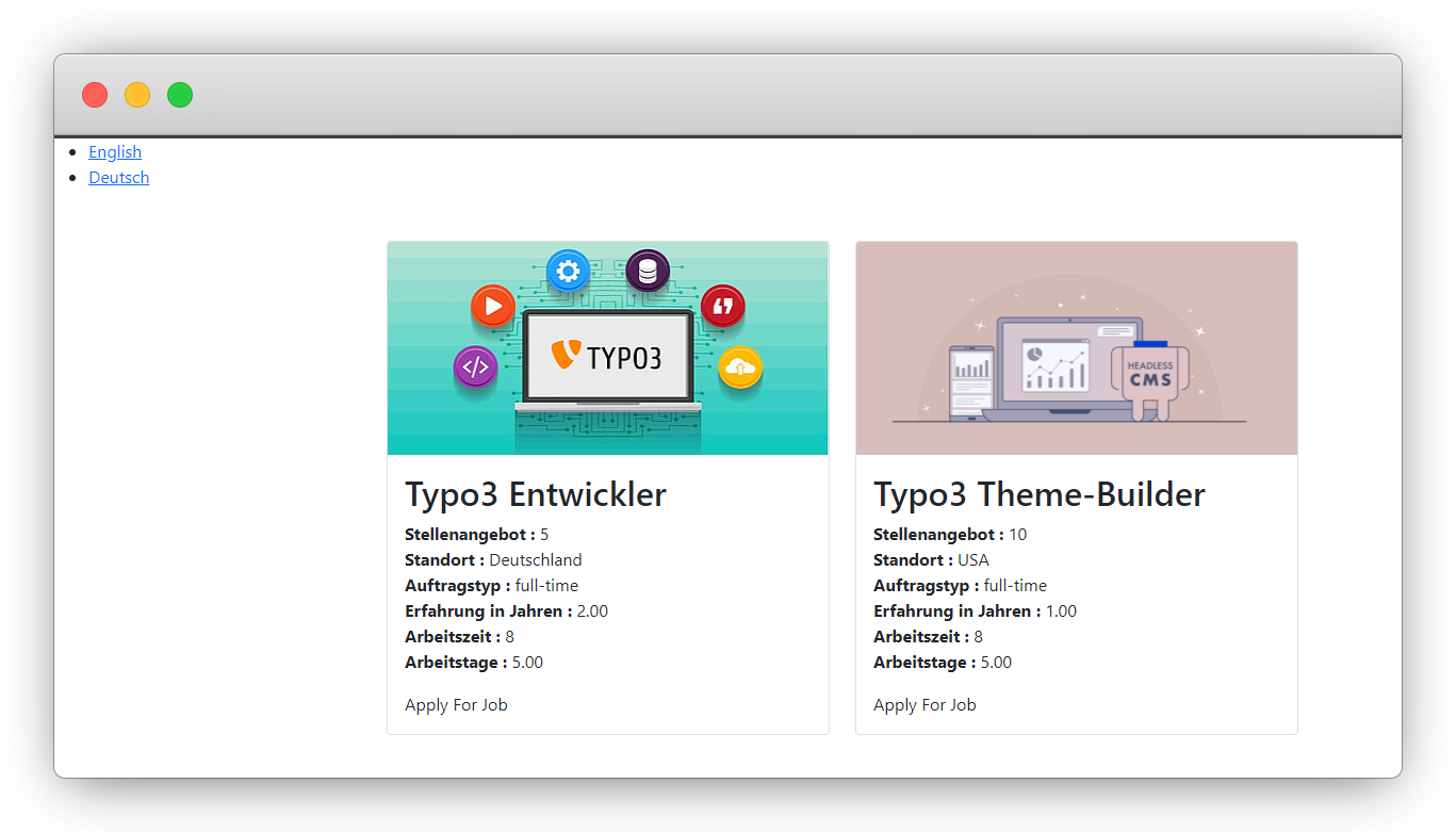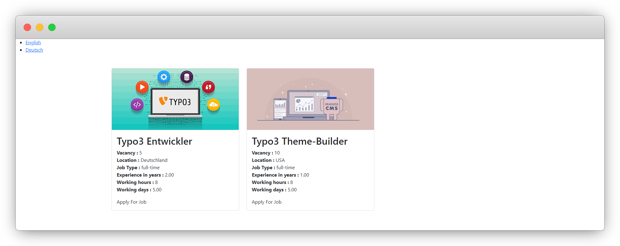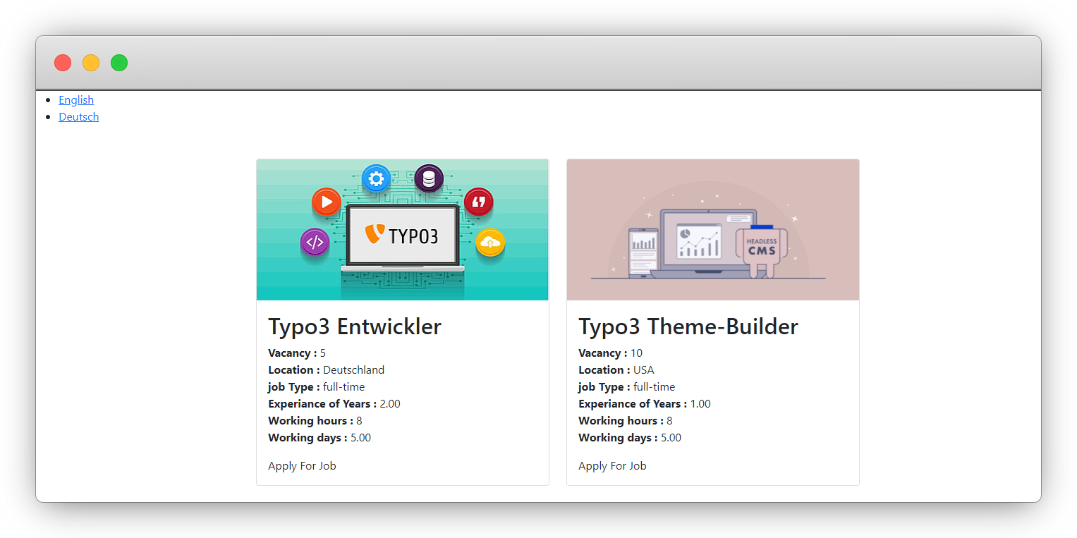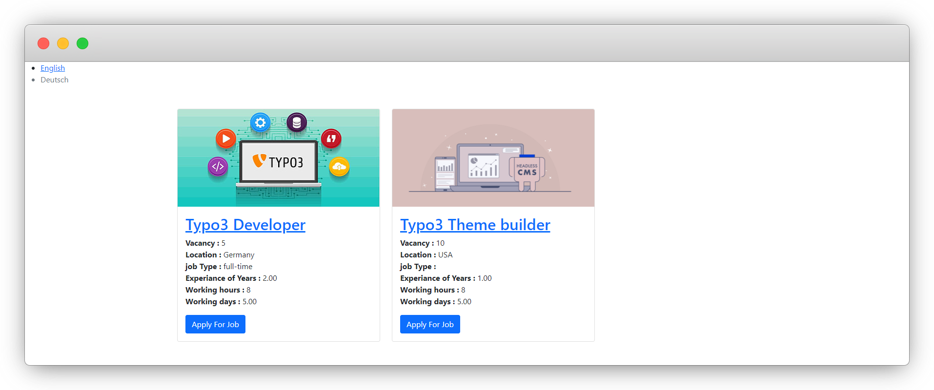 10. In the above screenshot, there is one issue that needs to be fixed, that is the button “Apply For Job” is still not rendering in German as we haven’t translated it in the template file for the Job plugin.