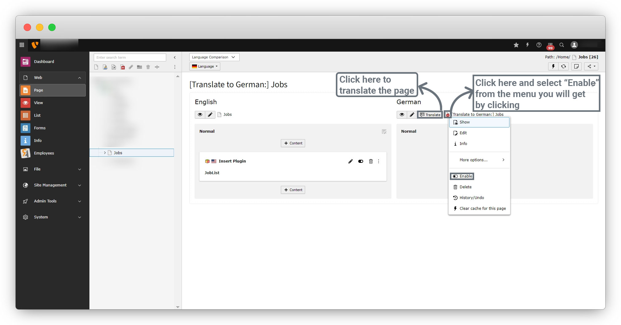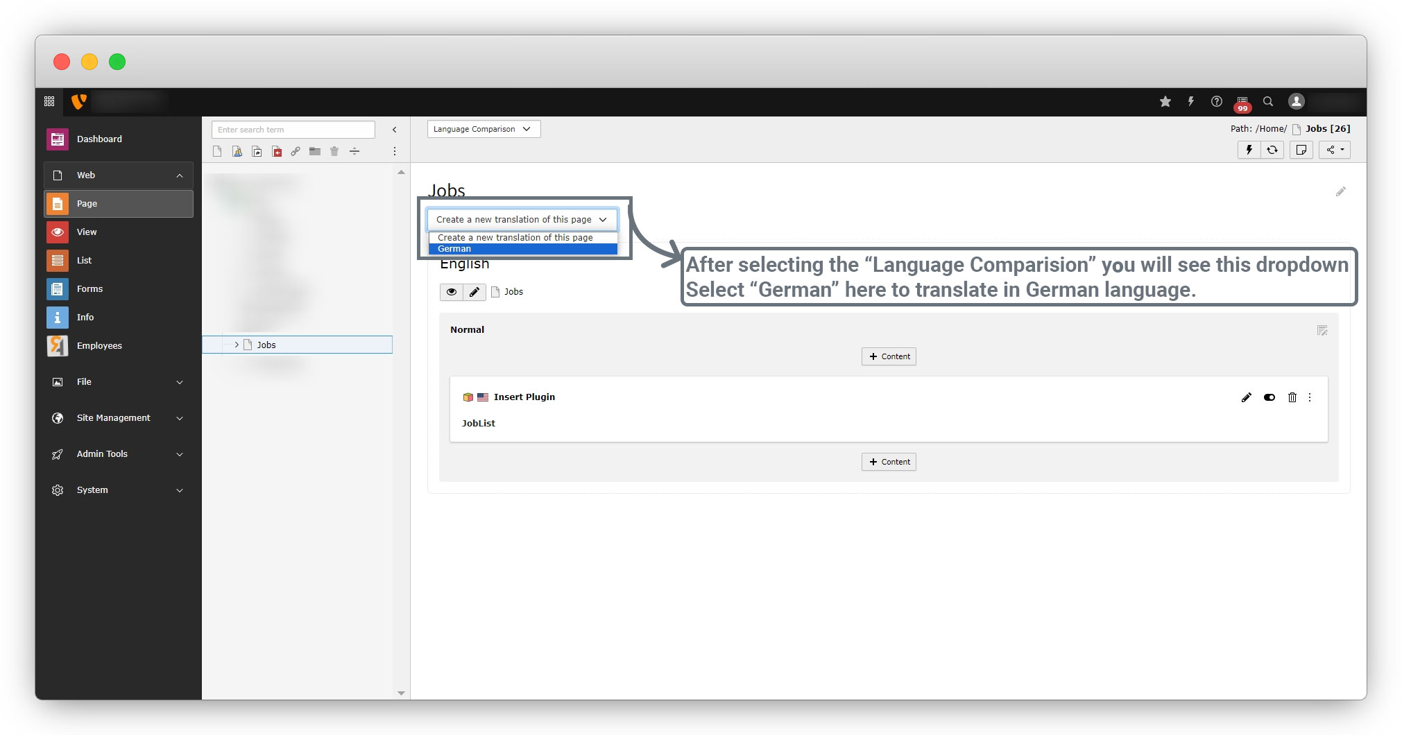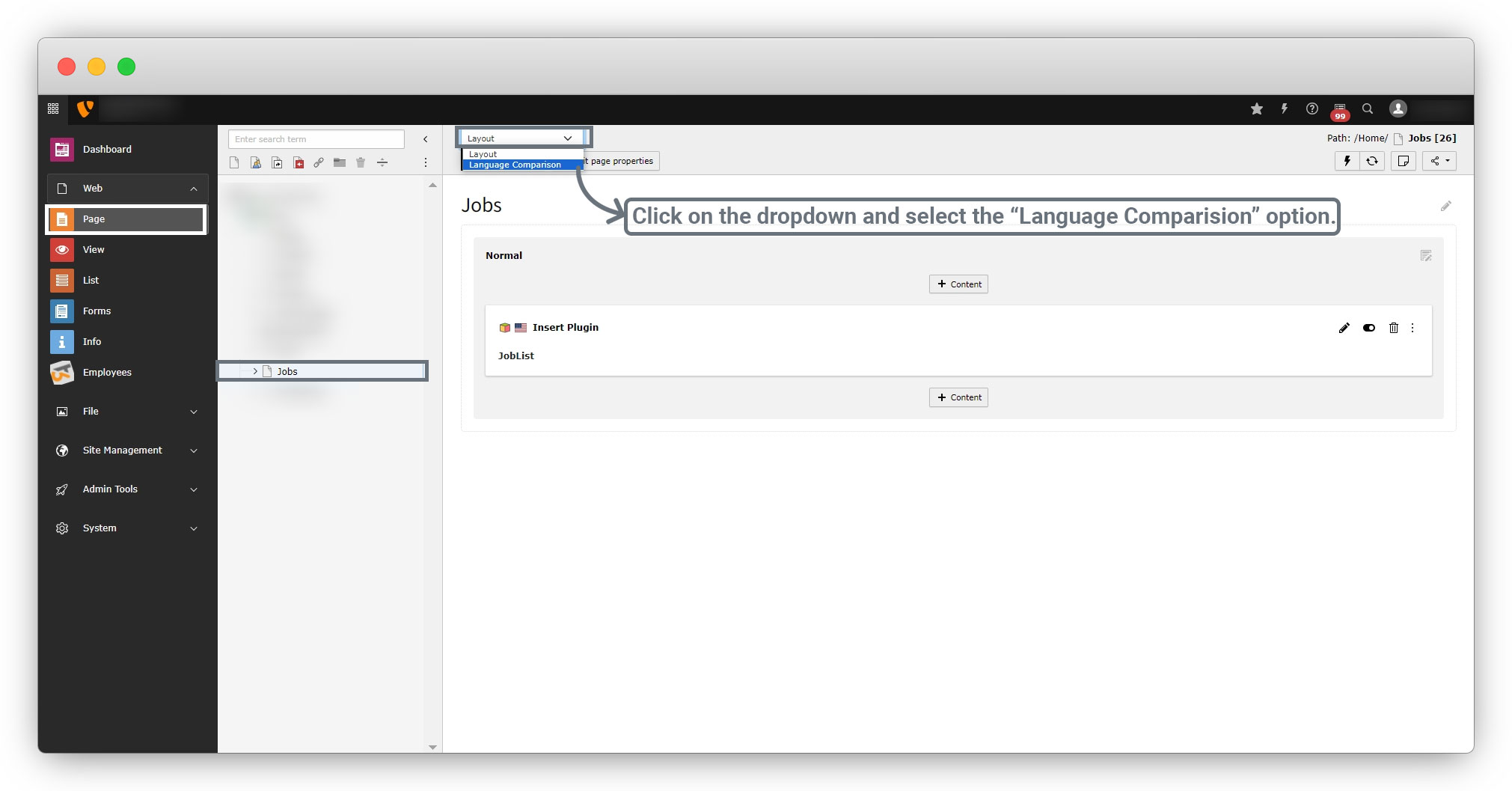 1. Go to the Page and select the page you want to translate, here we want to translate the Jobs page. Click on the page you want to translate, then go to the dropdown at the top-left and select “Language Comparision” as you can see in the screenshot below: