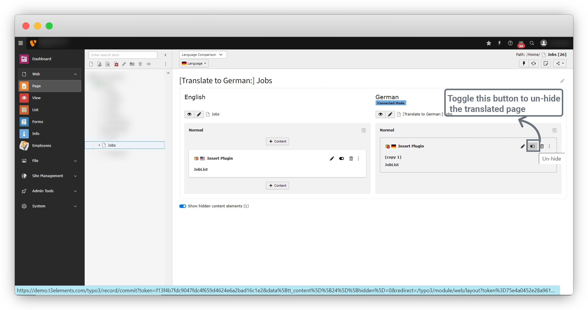 8. And you will see the translated page now, but it will be the hidden page. Toggle the un-hide button to un-hide the translated page.