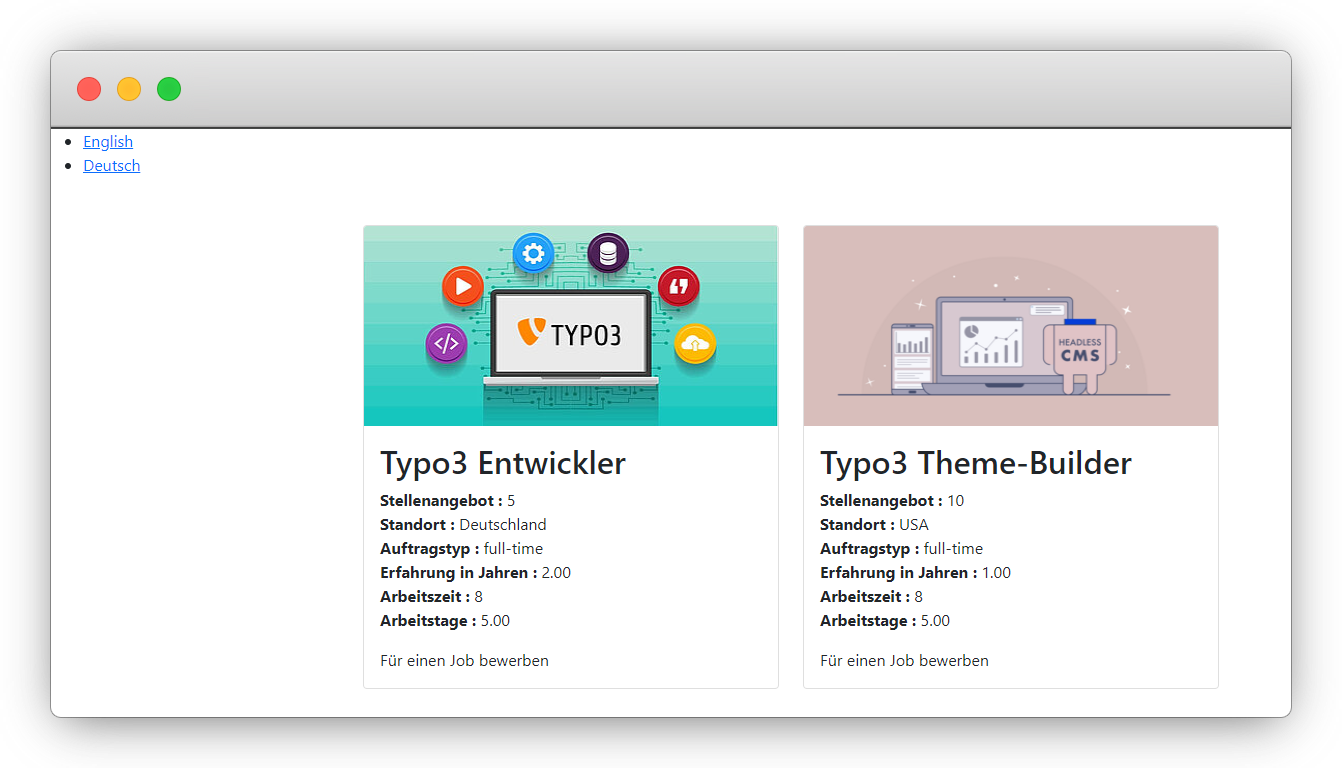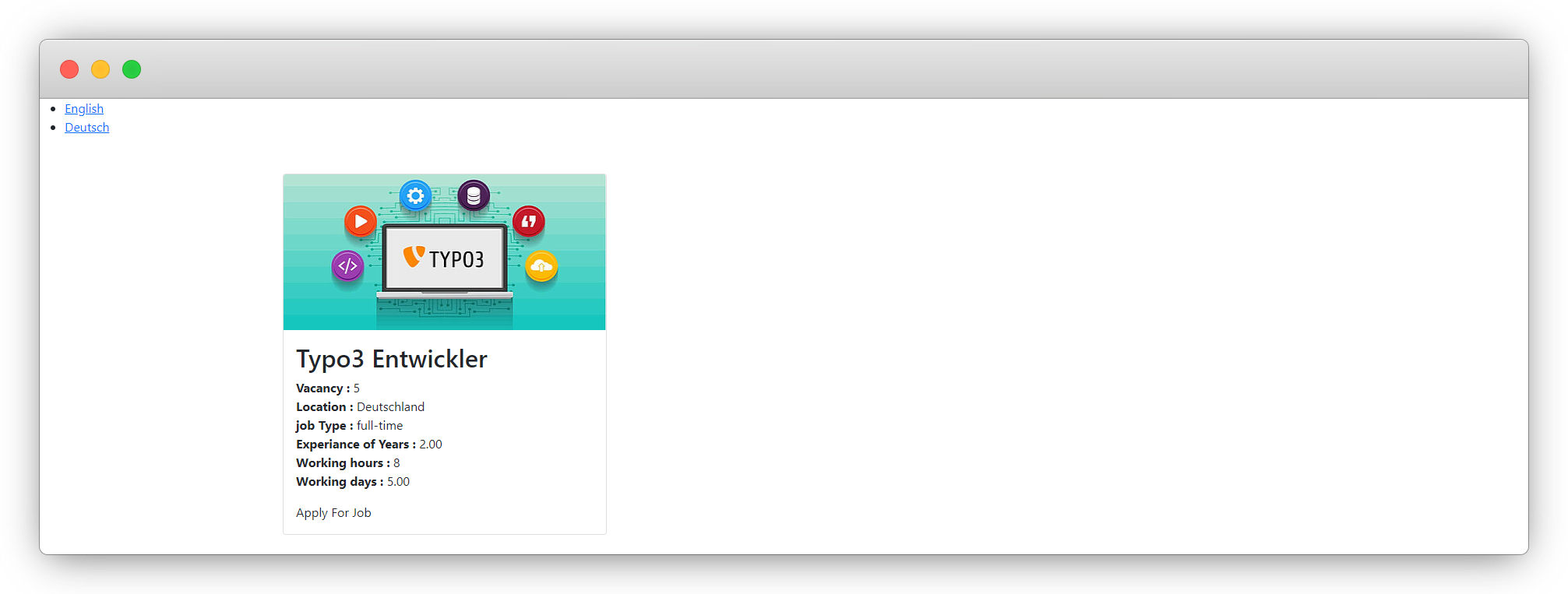9. After adding the above code Flush TYPO3 and PHP Cache and after reloading the job page you will see the language menu there as you can see in the screenshot below: