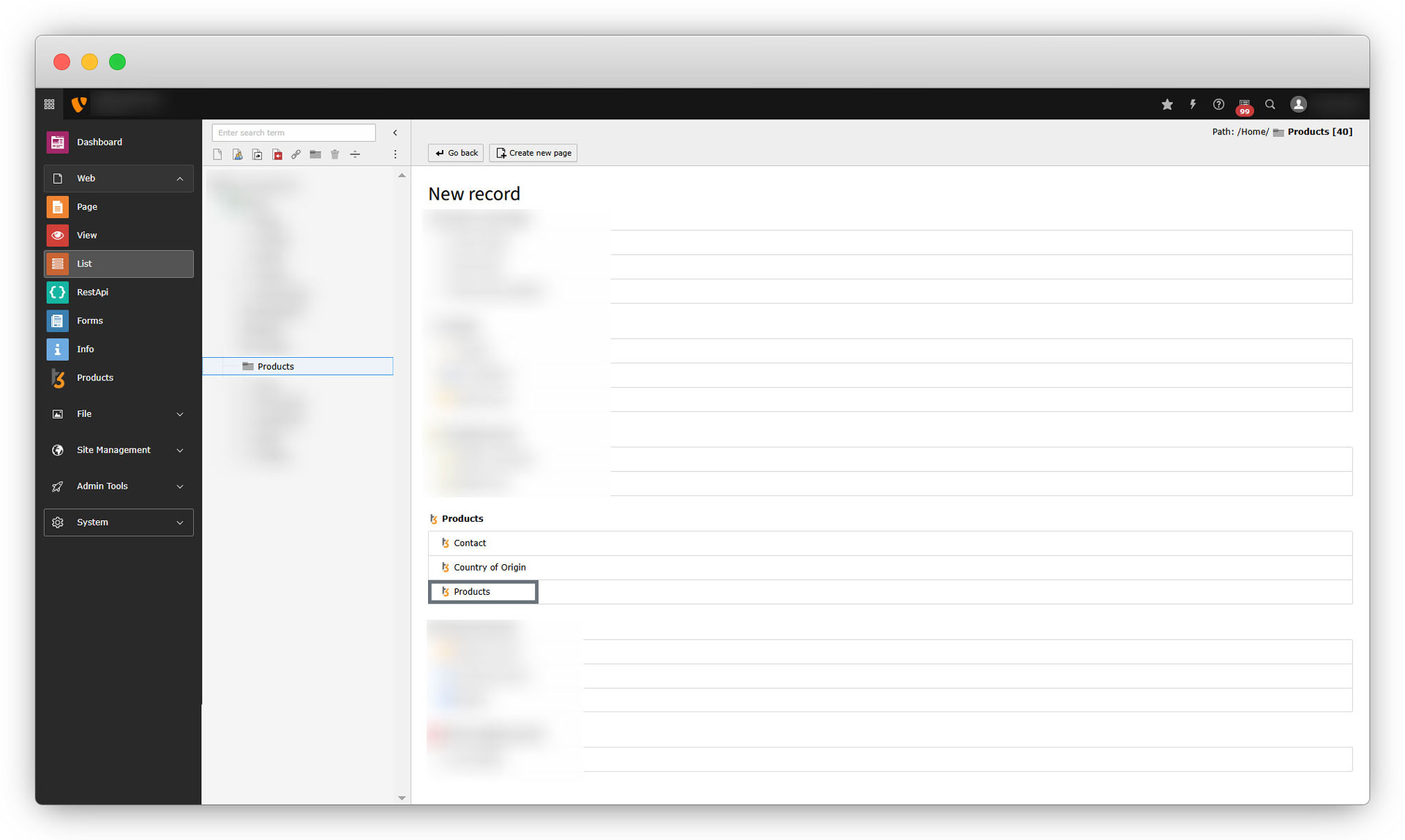 4. After clicking on the “Create new record”, you will see the “Products” extension and the tables “Products”, “Country of Origin”, and “Contact”.