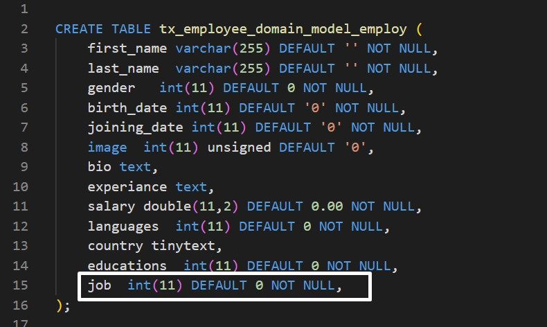 Below is the screenshot of the tx_employee_domain_model_employ table after adding the job field.