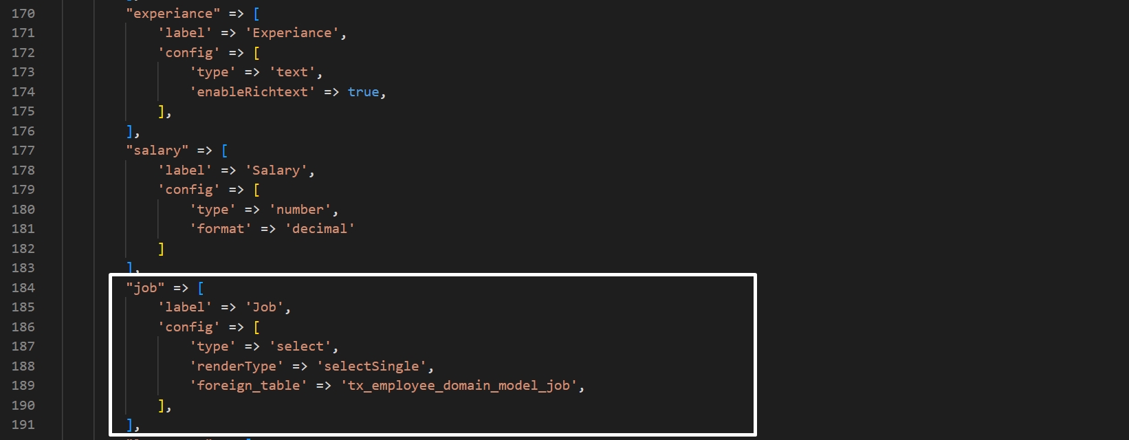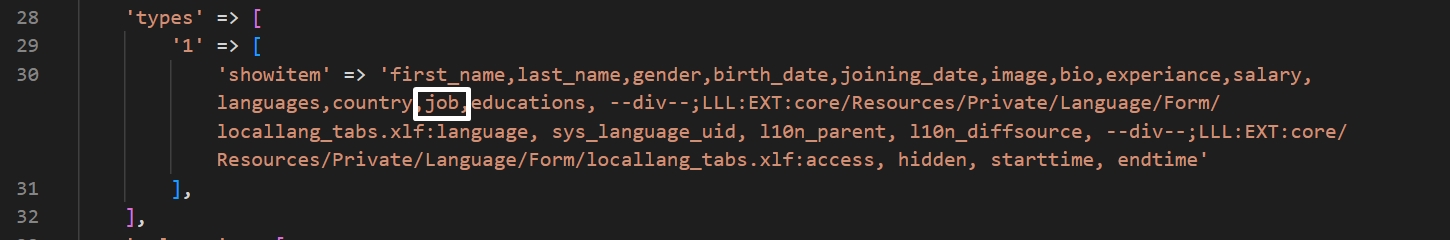 1. A column of the job is required to be added to the TCA file of the employ table. The file path is employeeConfigurationTCAtx_employee_domain_model_employ.php