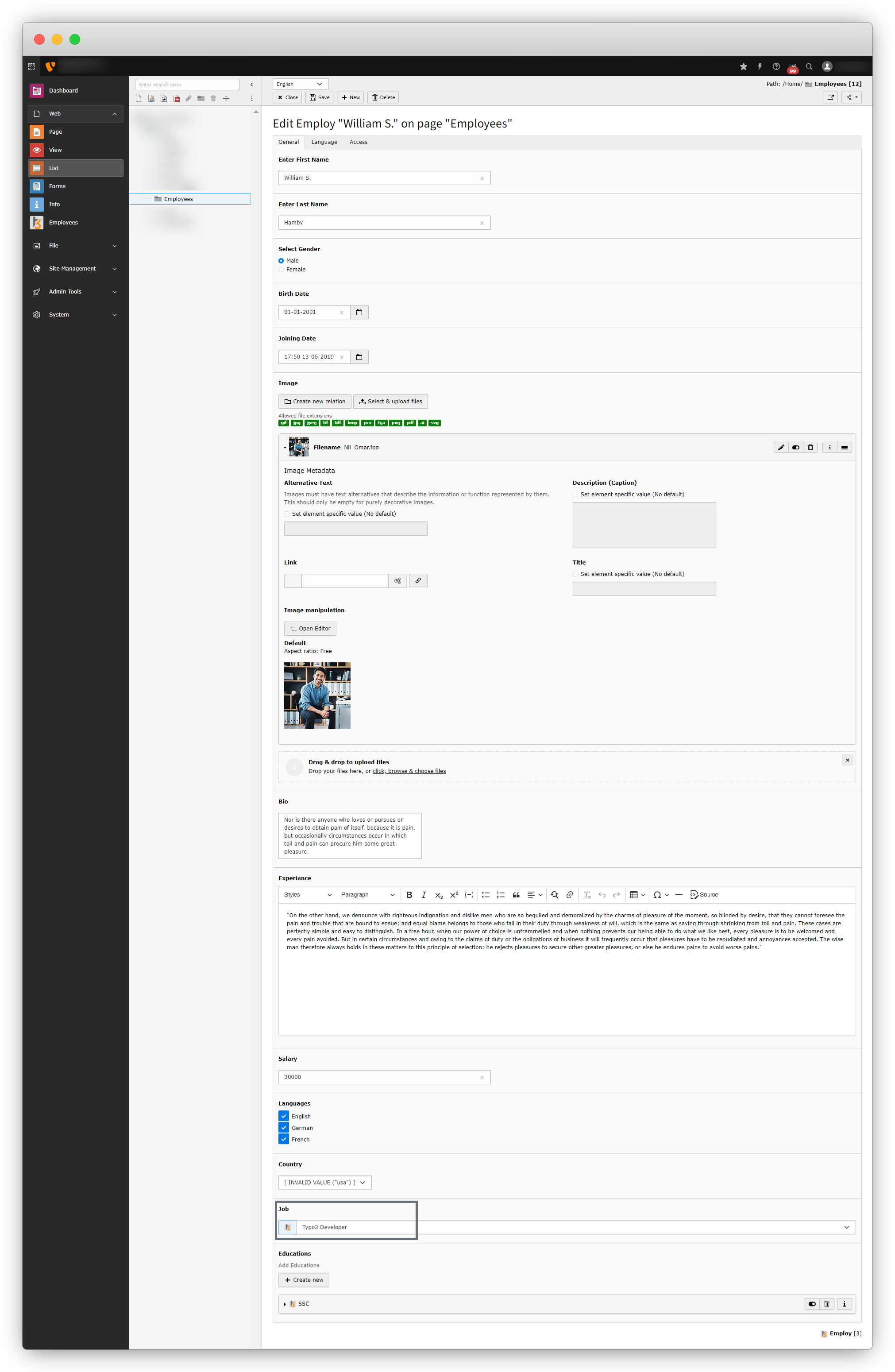 Save the file, toggle the extension (Deactivate once and then activate again), or go to Maintainance > Flush TYPO3 and PHP cache and click on the button “Flush cache” and then go to the List > select folder where you have stored all the employees > go to the Employ, select any record and you will see the option to select the job as you can see in the screenshot below