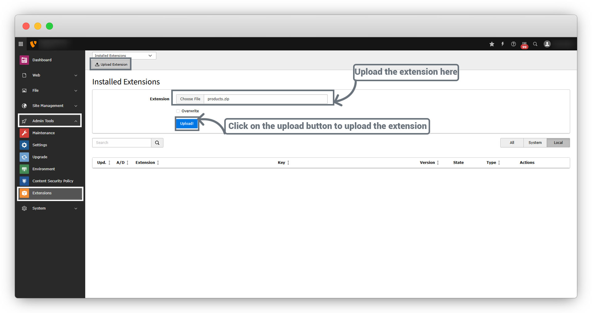 If you already have uploaded the extension before and want to upload the new version of that extension after editing it, just upload by checking the overwrite option. As seen in the screenshot below, upload the extension but be sure the name is the same as the installed version of that extension and check the “Overwrite” checkbox to overwrite the existing extension.