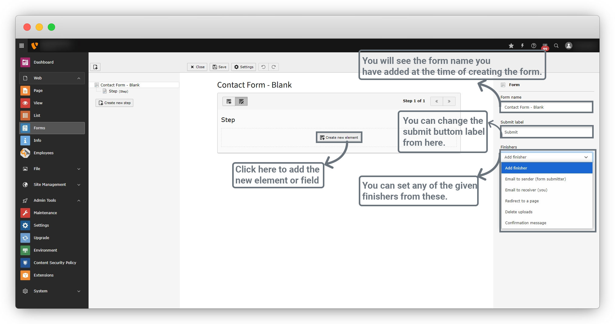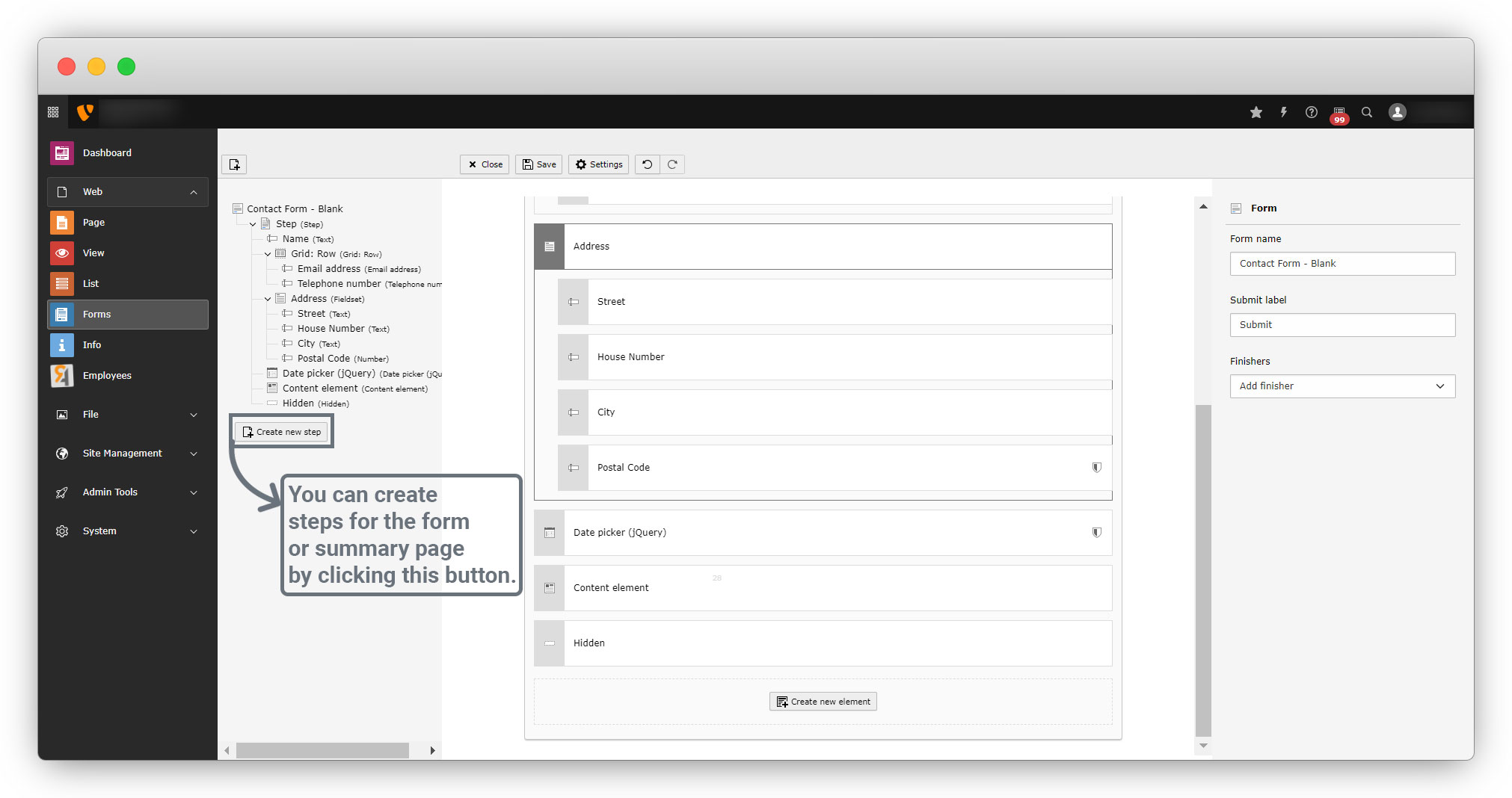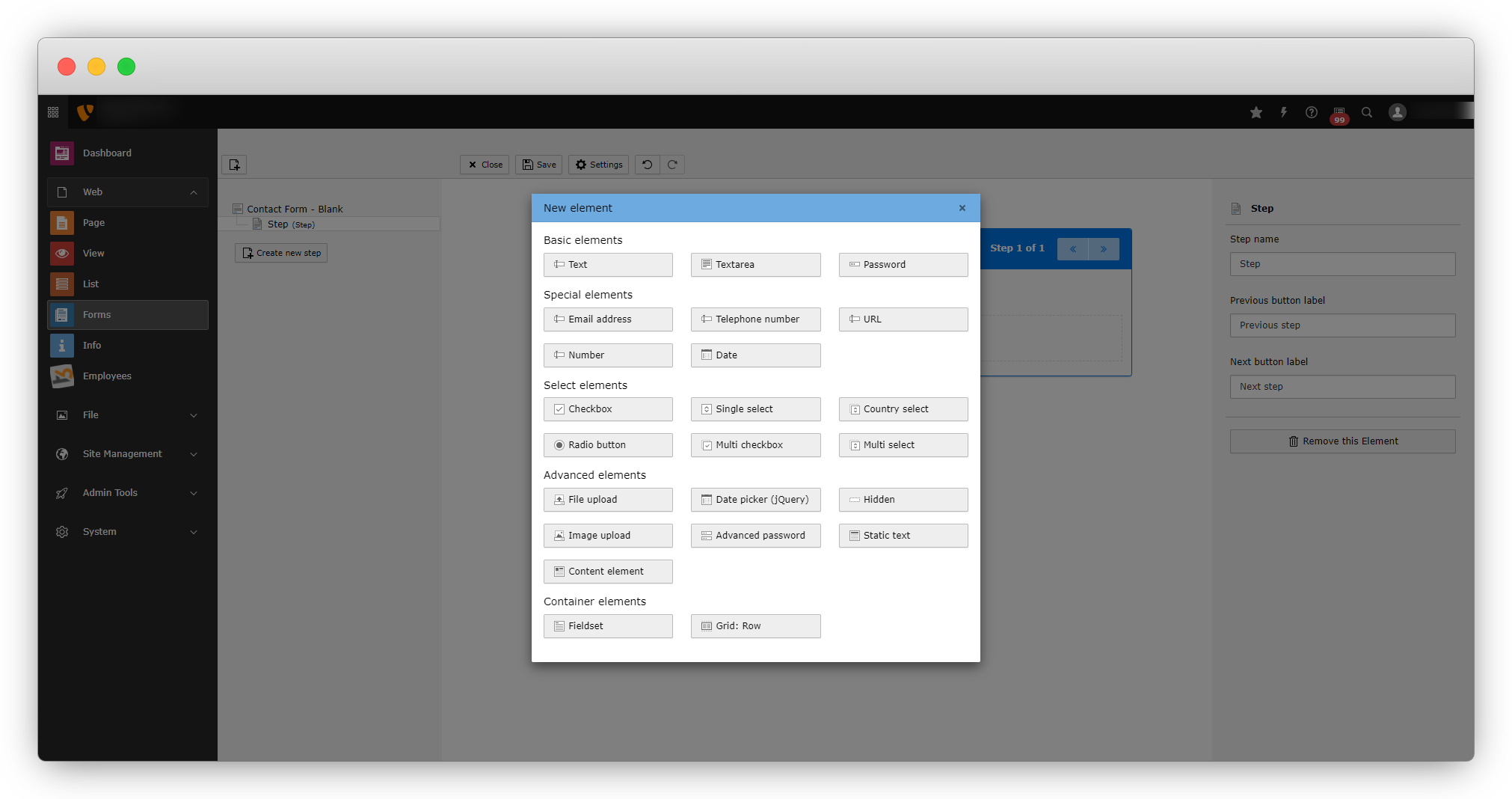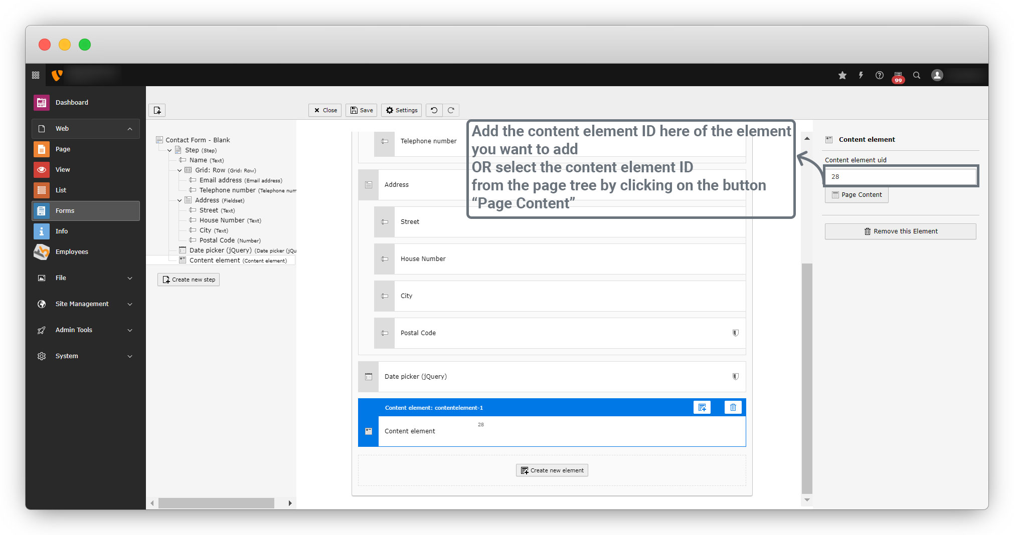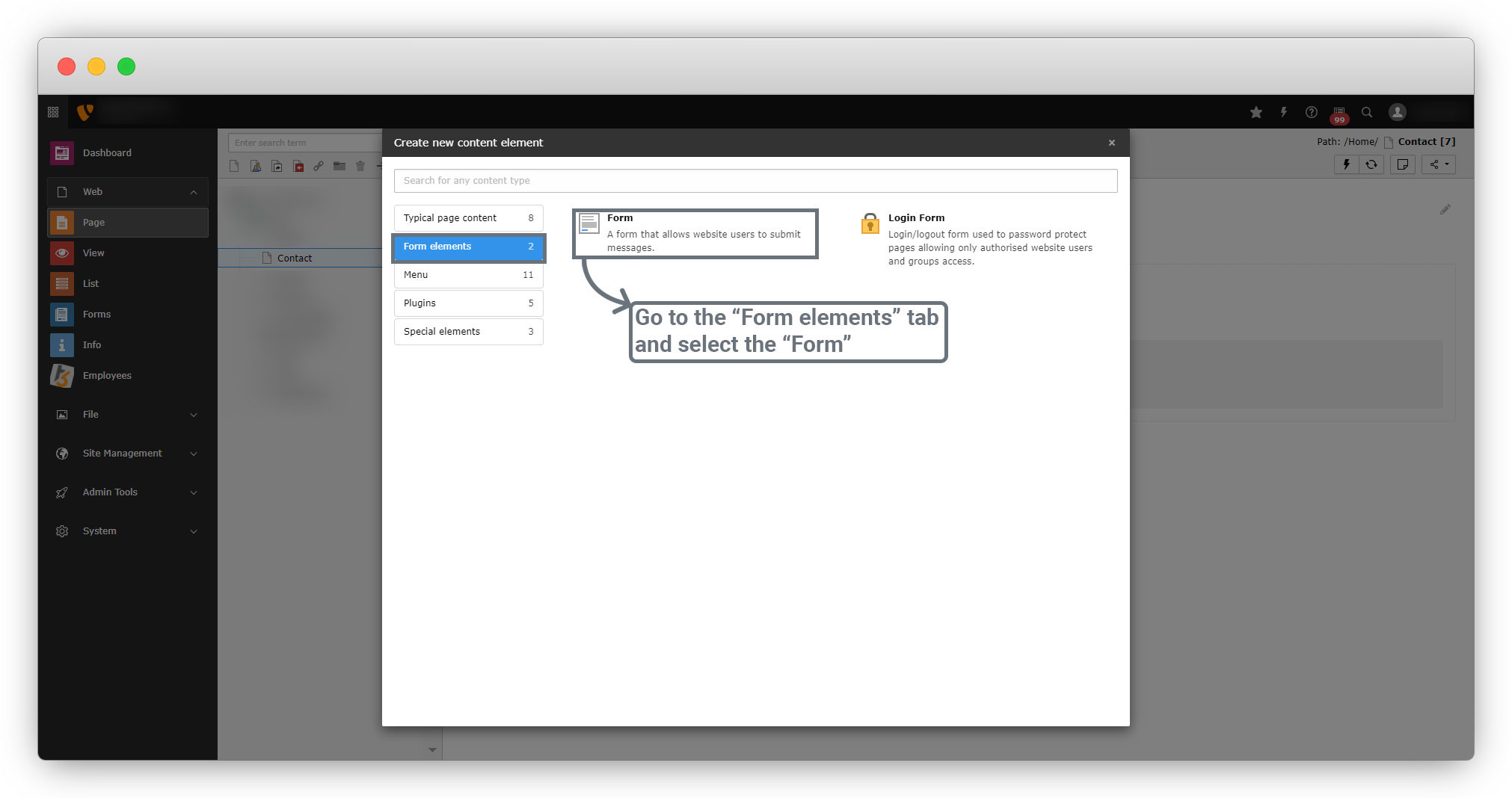 5.2. Click on the “+Content” button, select the “Form elements” tab, and select “Form” and you will see the plugin is added to your page.