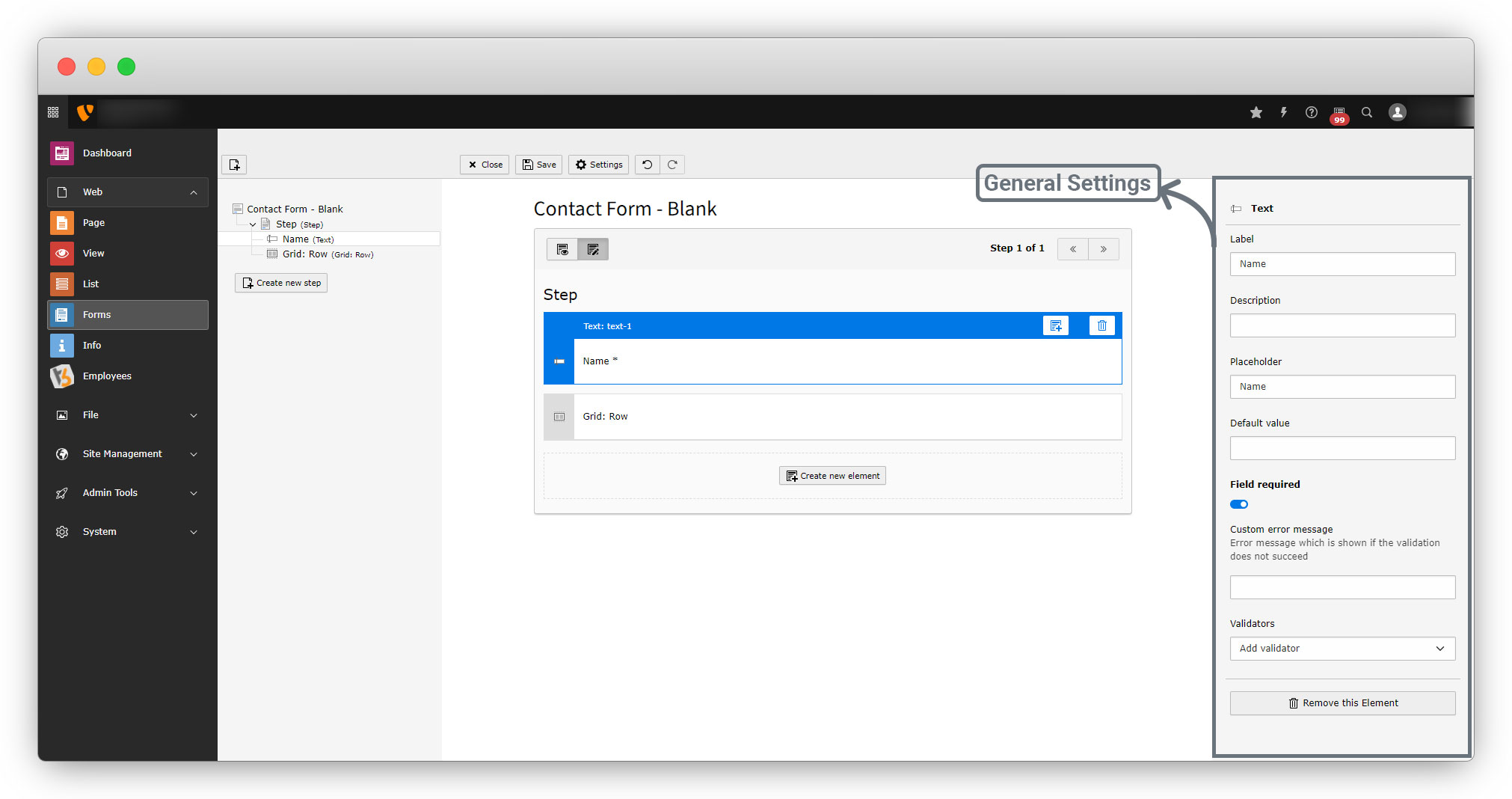 - Validator: You can add validators for specific fields from here. You can see more details about validators in the section Validators.