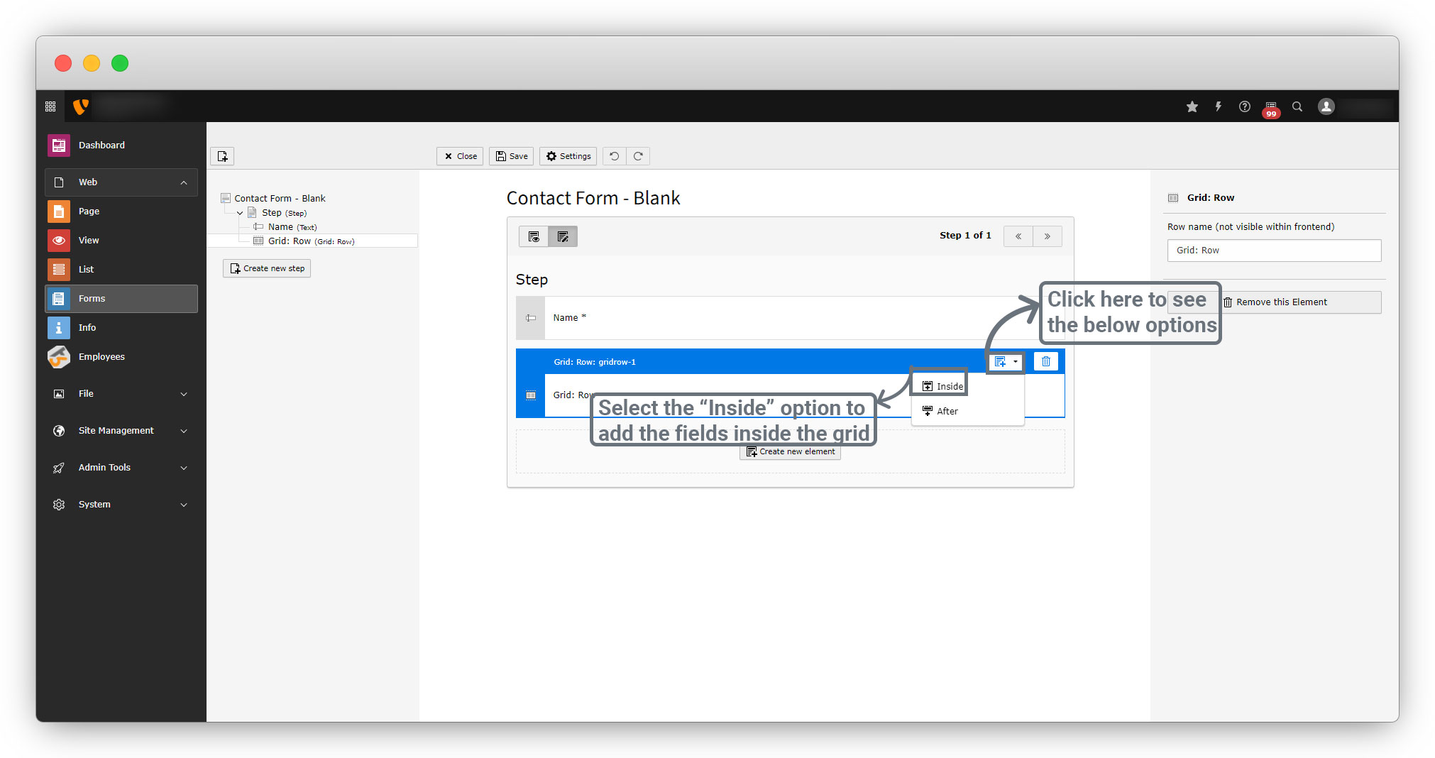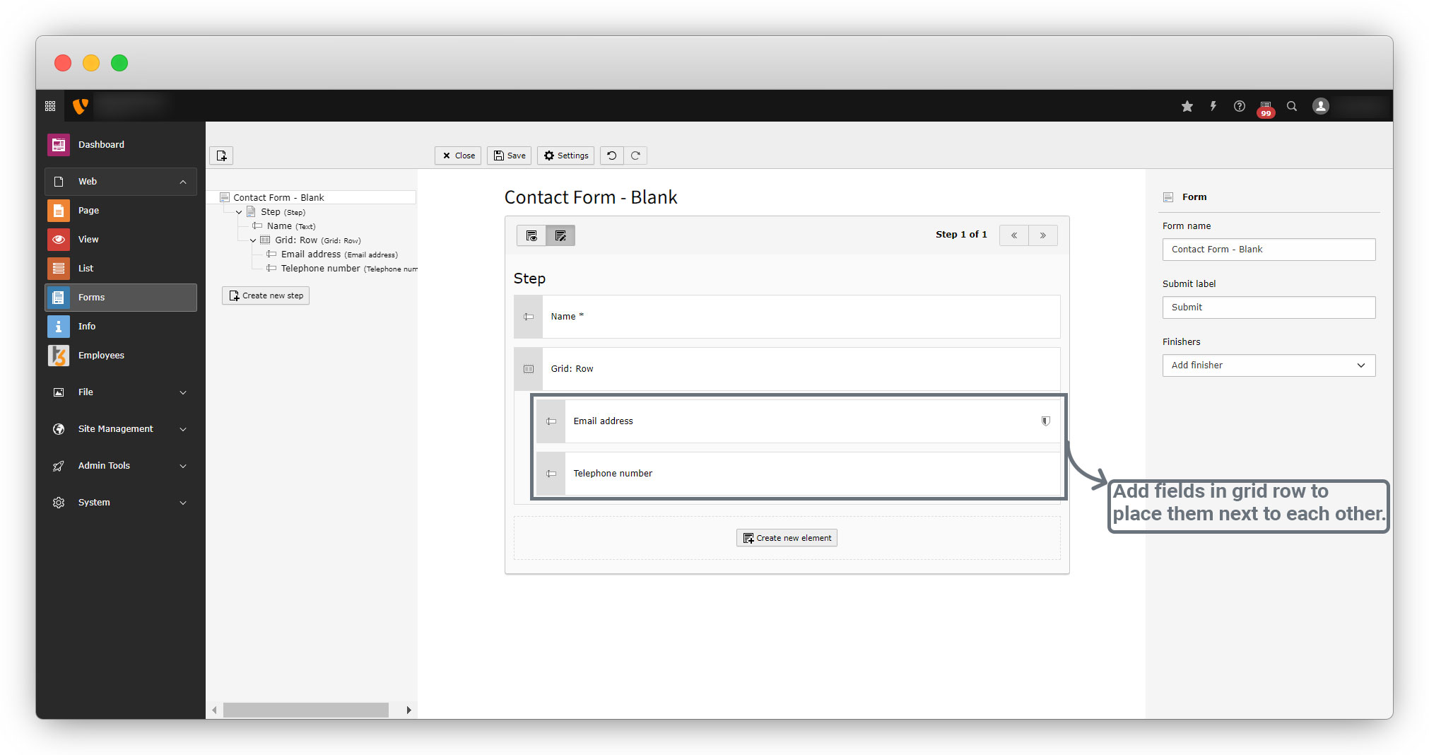4.3. As you can see in the screenshot below, we have added the Text field from “Basic elements” and a Grid: Row field from “Container elements”.