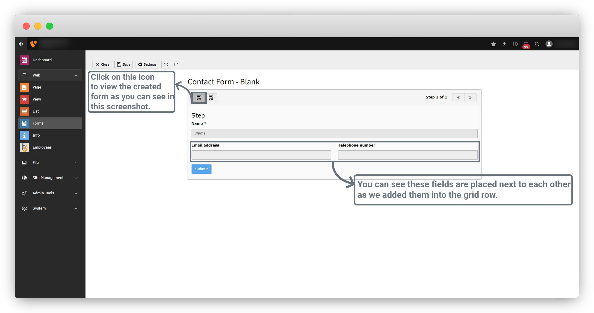 3. After adding the fields you can see the form by clicking the view icon on the top left of the form as seen in the screenshot below: