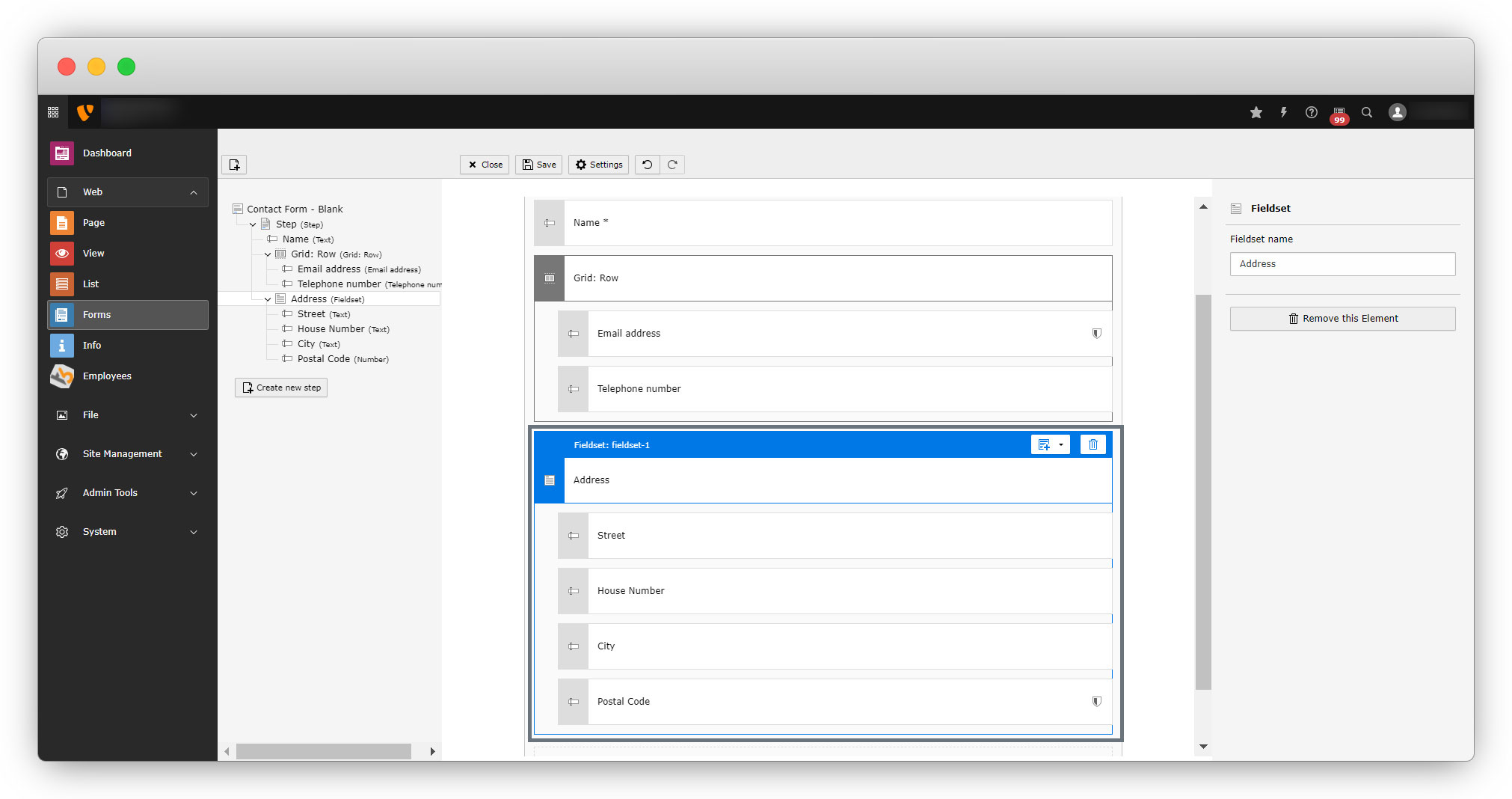You can use this container to group several elements in the form. This is a content-based structuring, i.e. you create a context content-wise. This is awarded by screen readers and helps you to improve the accessibility of your form. A typical fieldset would be, for example, “Address”. Within this fieldset you have form elements for the street, house number, postal code, and city. The settings for this element are: