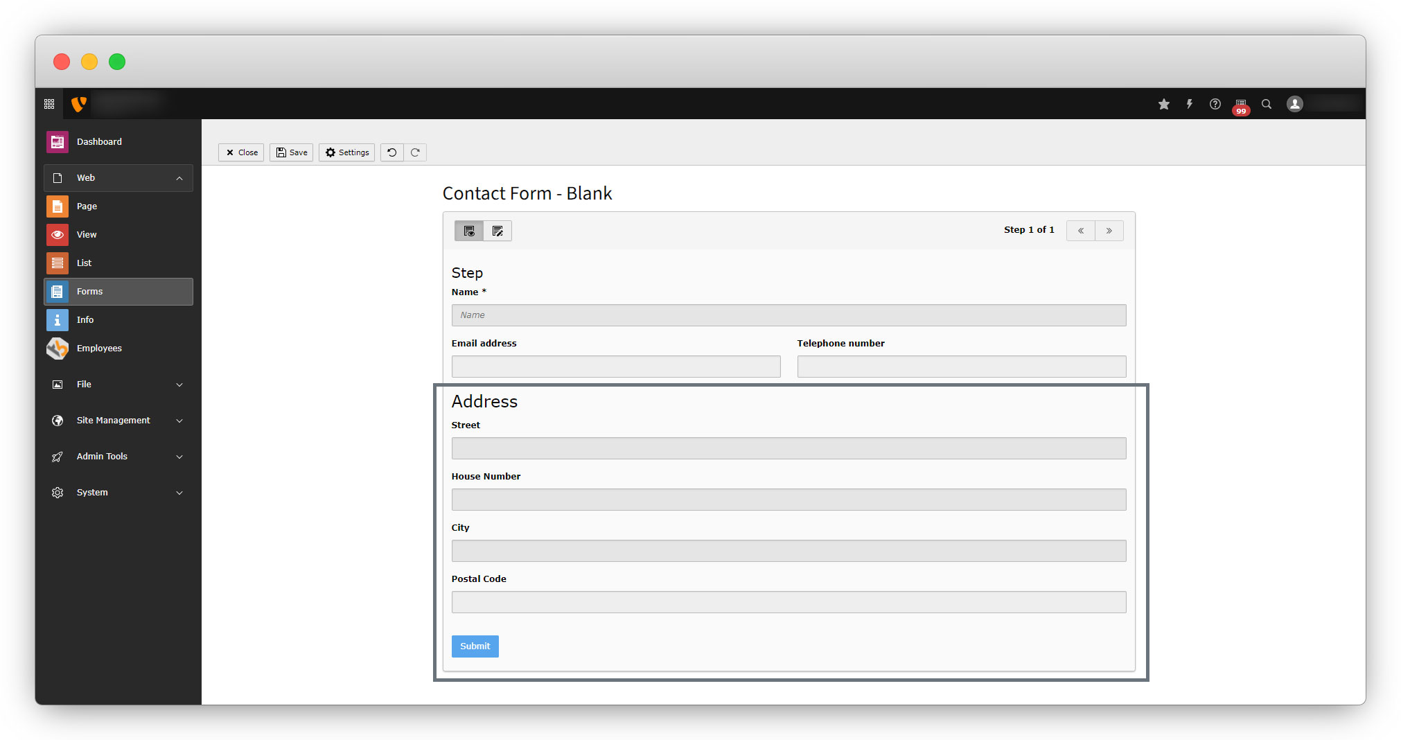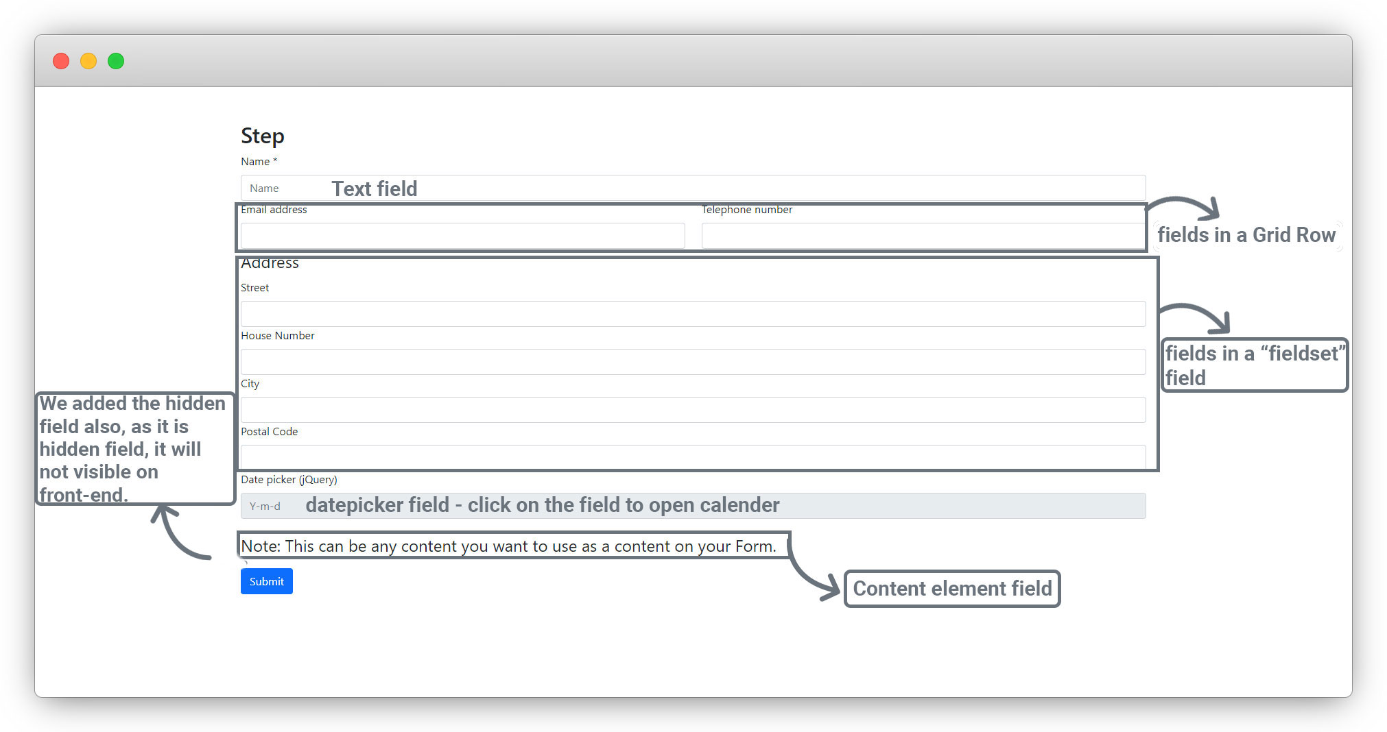 2. You can see in the above screenshot that the fieldset element has taken and labeled as “Address”, and that contains other fields like street, house number, city etc.