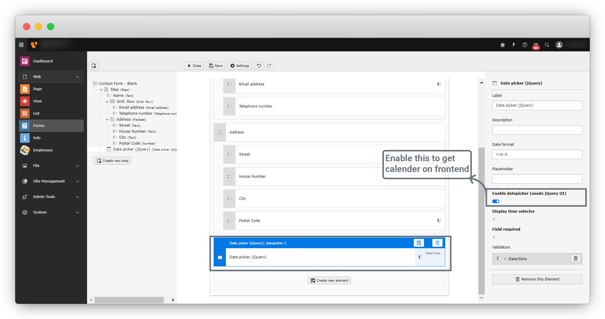 A single-line text field to select a date using a calendar. A JavaScript library is used for this purpose. The settings for this element adhere to the default. Additional settings: