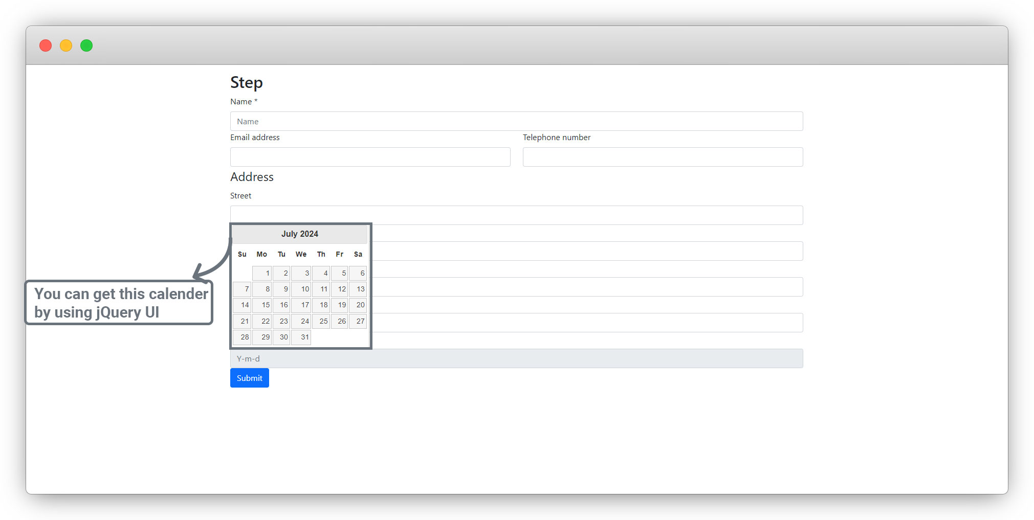 4. You will need to add the jQuery UI (download jQueryUI – https://releases.jquery.com/ui/) to get the calendar for the datepicker field in front-end as seen in the screenshot below:
