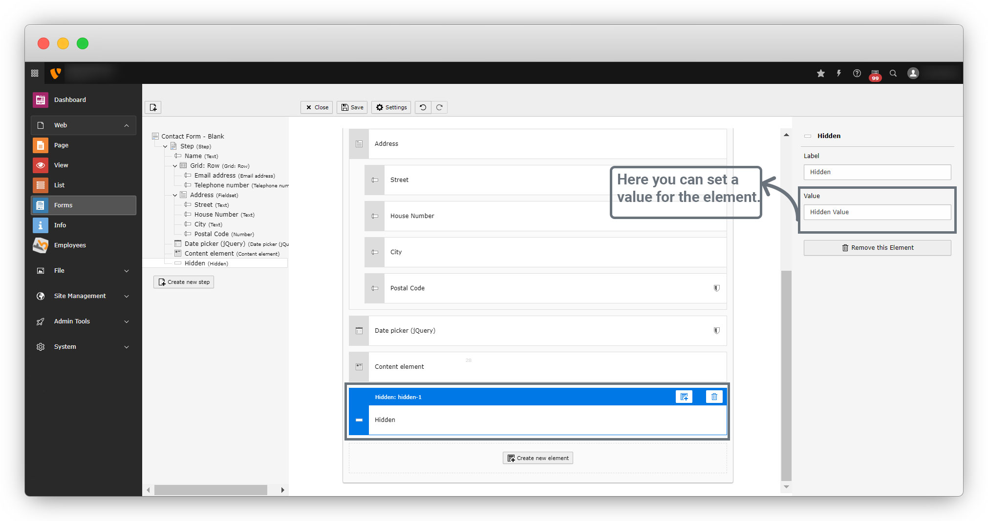 This field is not visible in the front-end. Such a field is usually needed for technical aspects, e.g. to add hidden values to the form. The settings for this element adhere to the default. Additional settings: