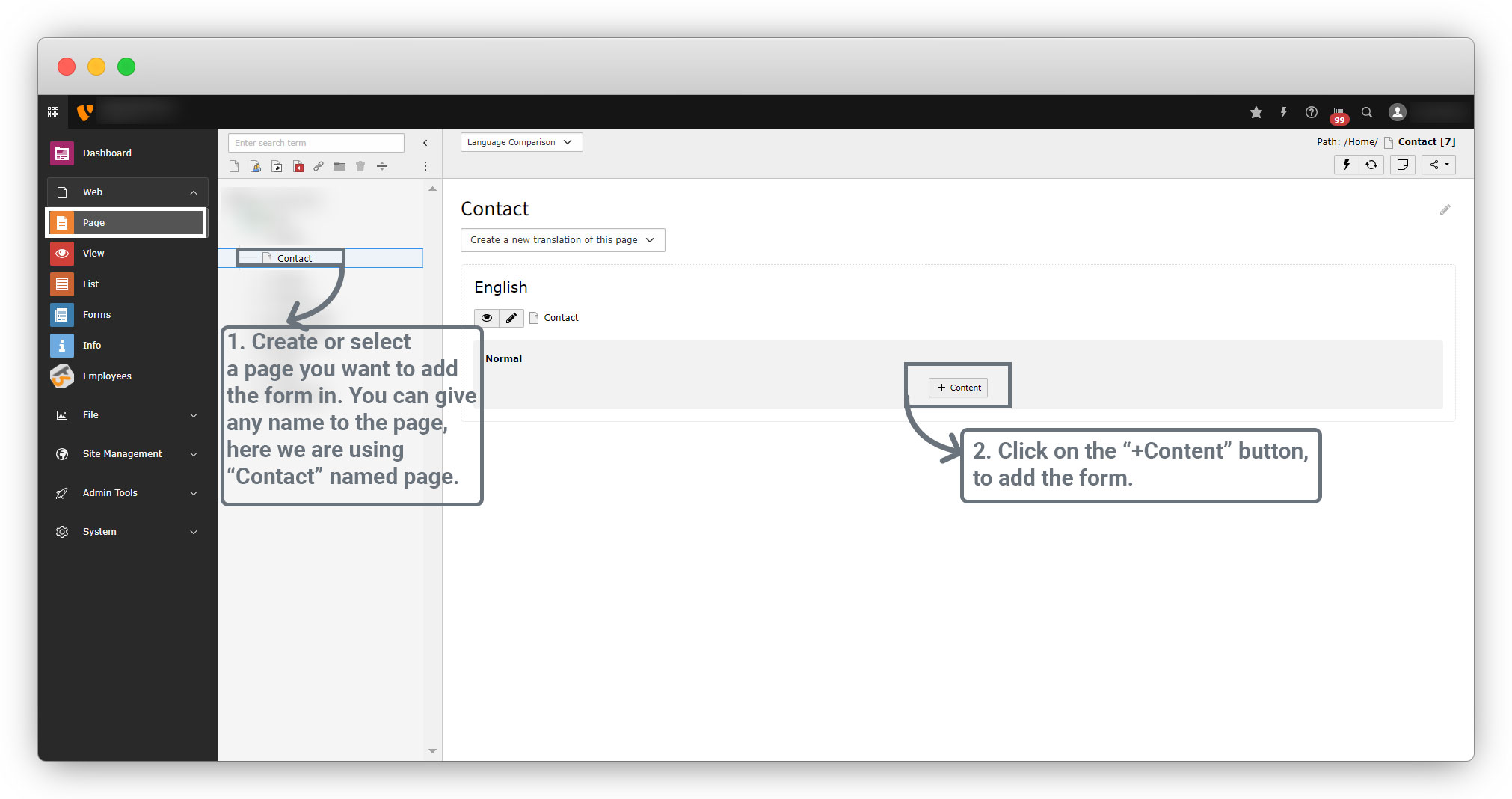 5.1. Create a new page or select the existing page, the page name is “Contact” here, but you can assign any name to the page.