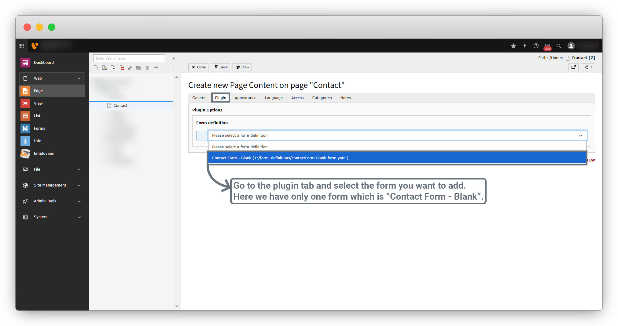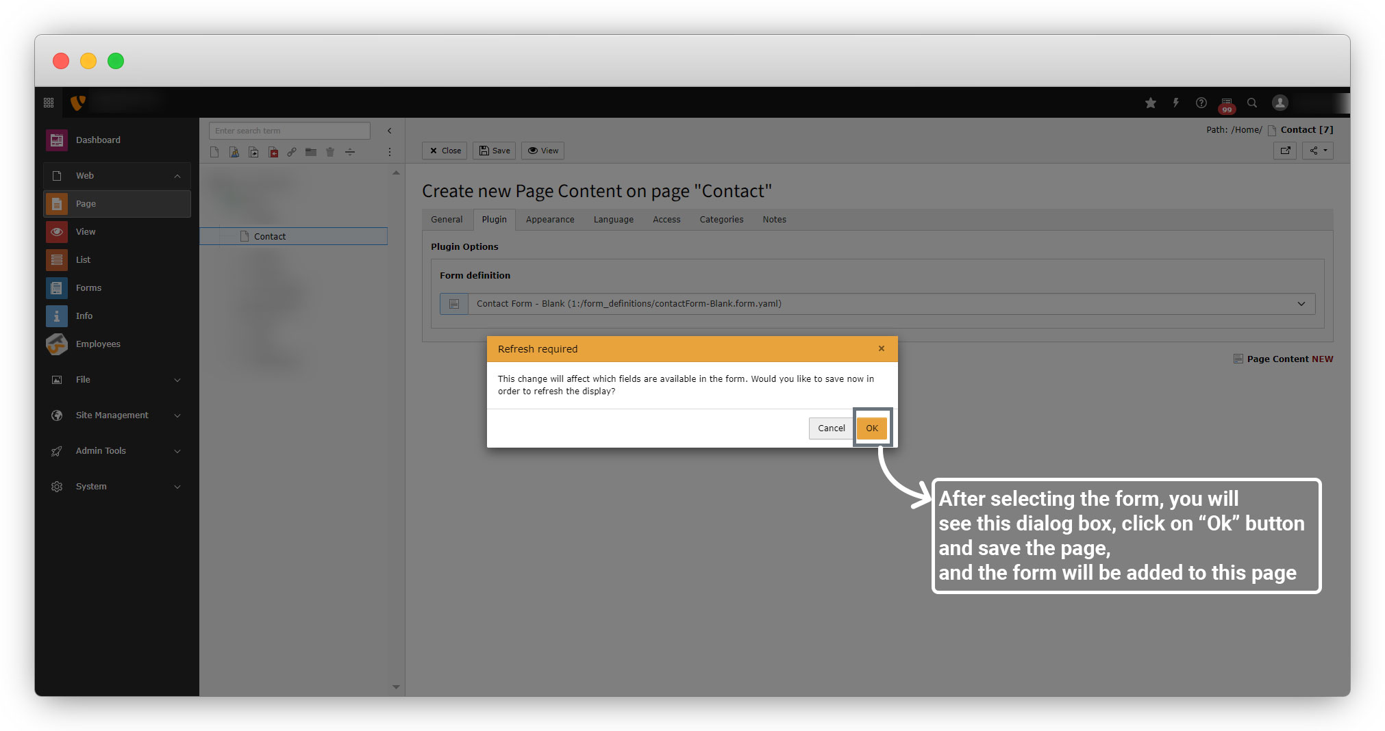 5.3. Then go to the plugin tab and select the form you want to add to the page, you will see a dialog box, click on the “ok” button and save the page.