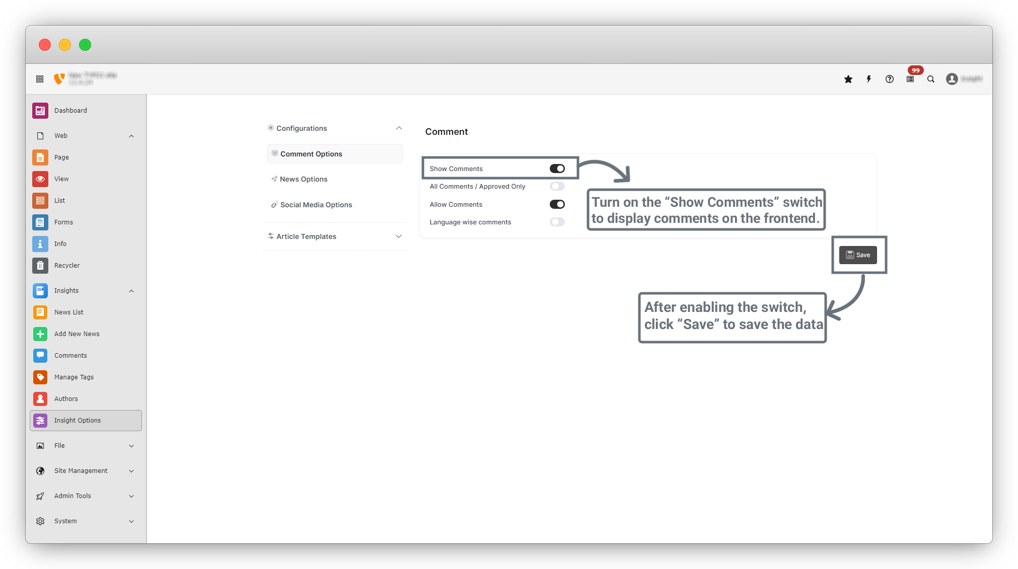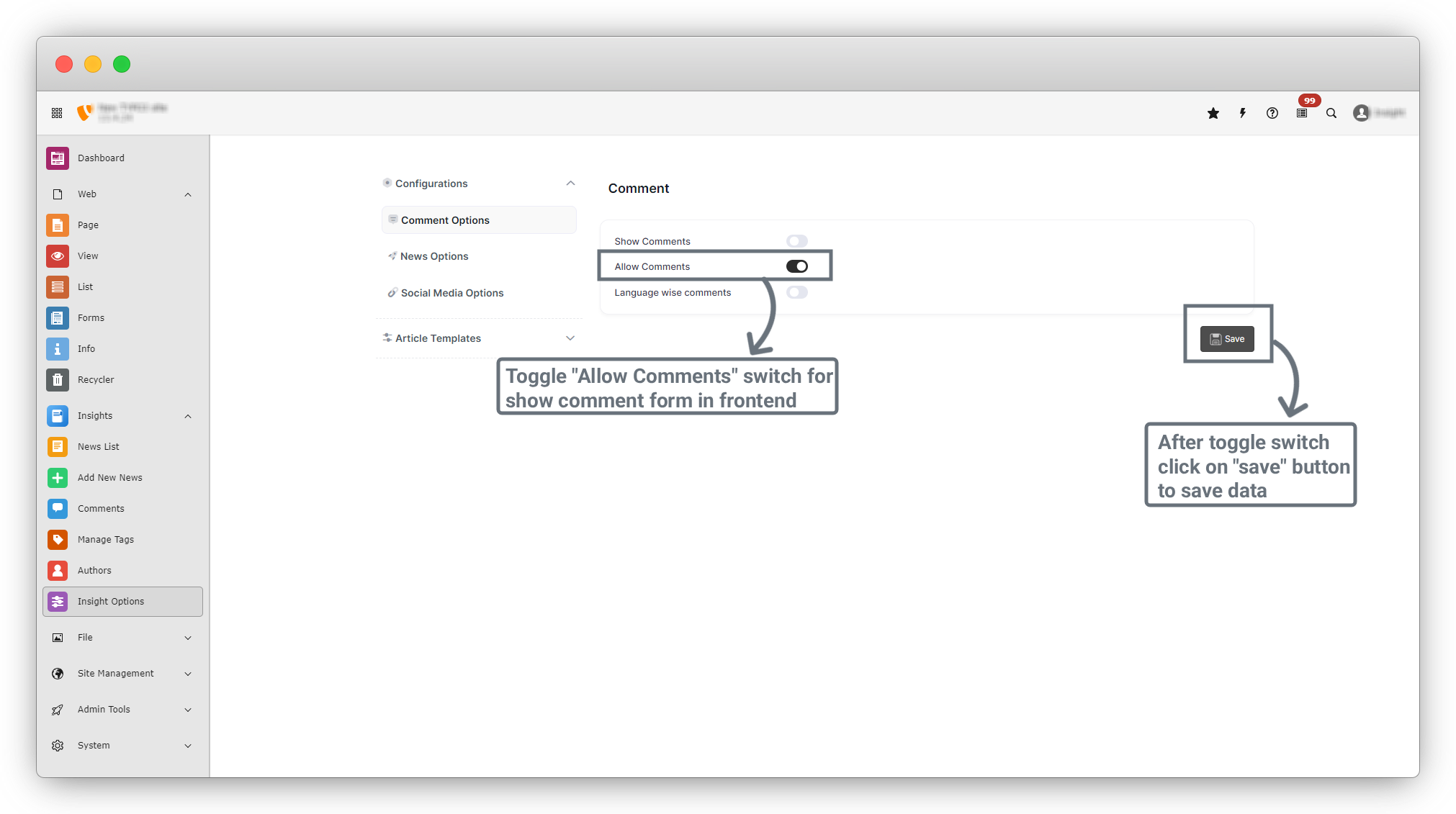 2. Enable the “Allow Comments” option under Comment Options. This will add a comment form to the News Details page, allowing users to submit comments. Click the “Save” button after enabling the option.