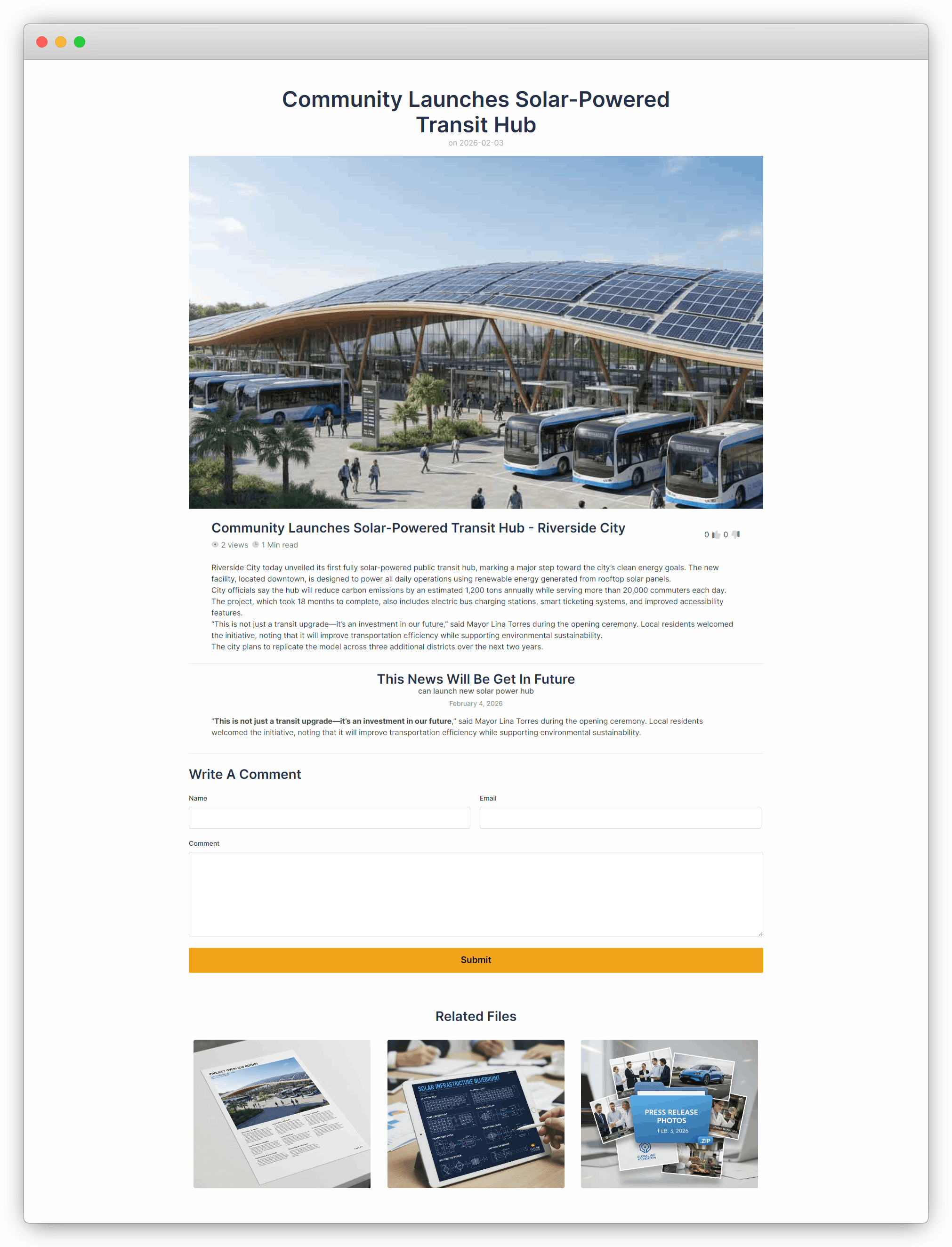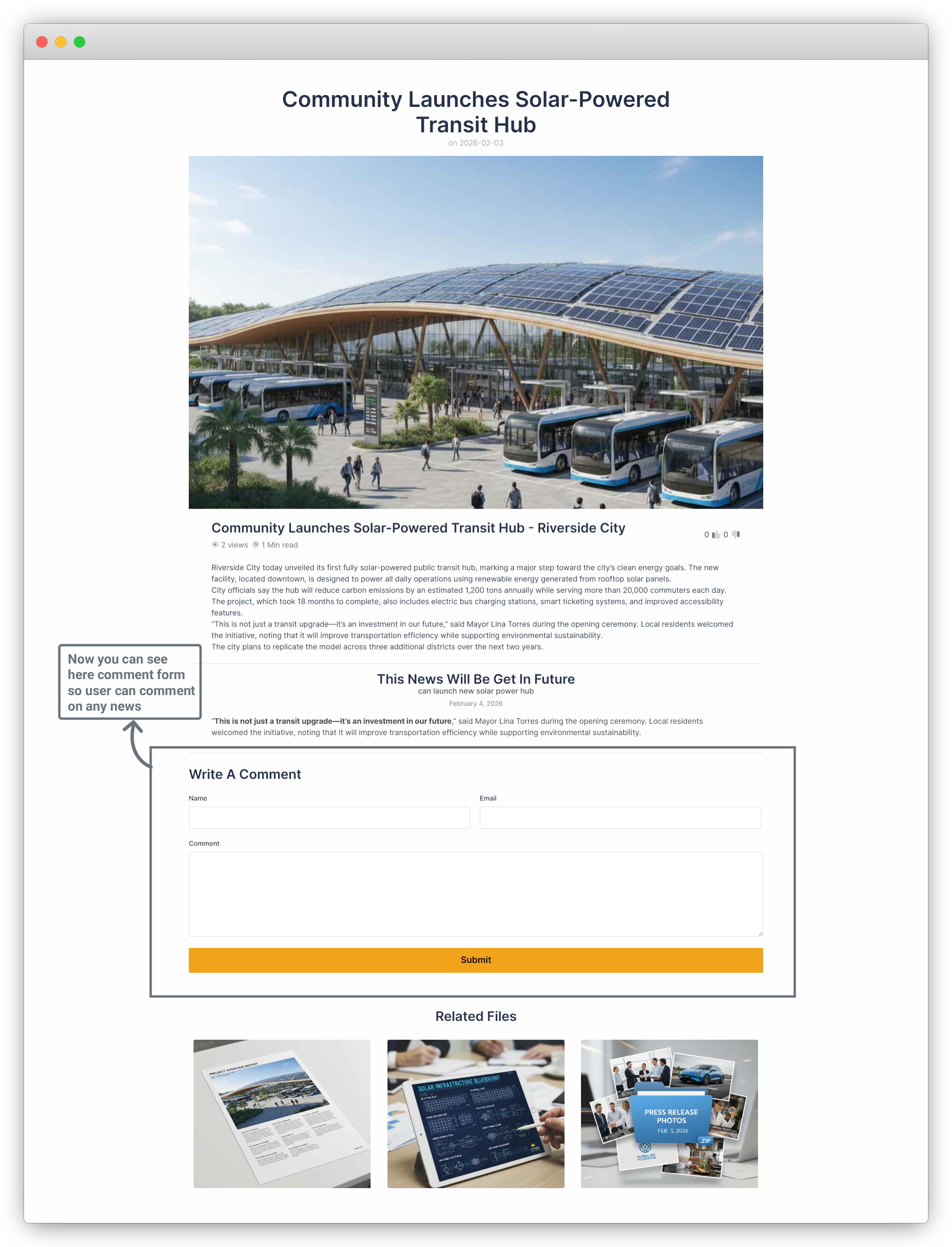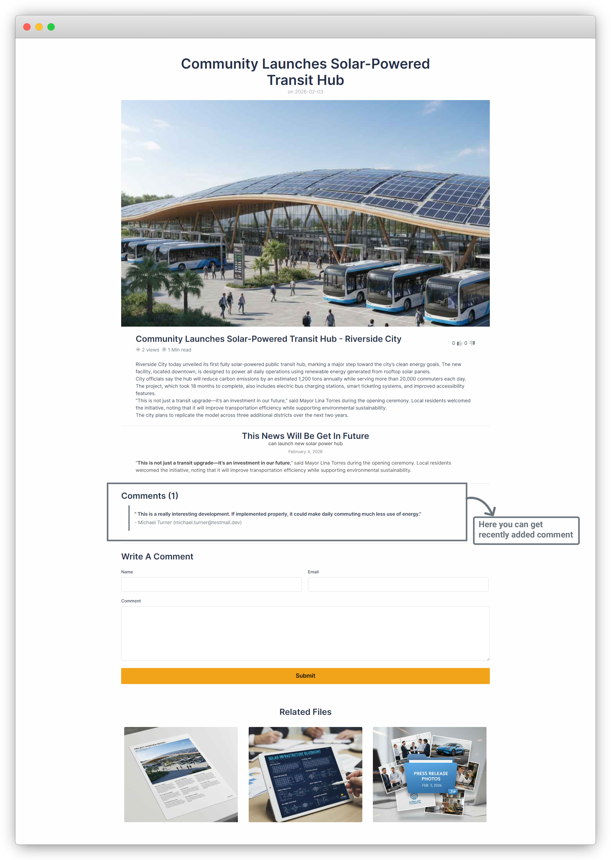 7. Return to the News Details page on the frontend. You will now see the submitted comment displayed on the page.