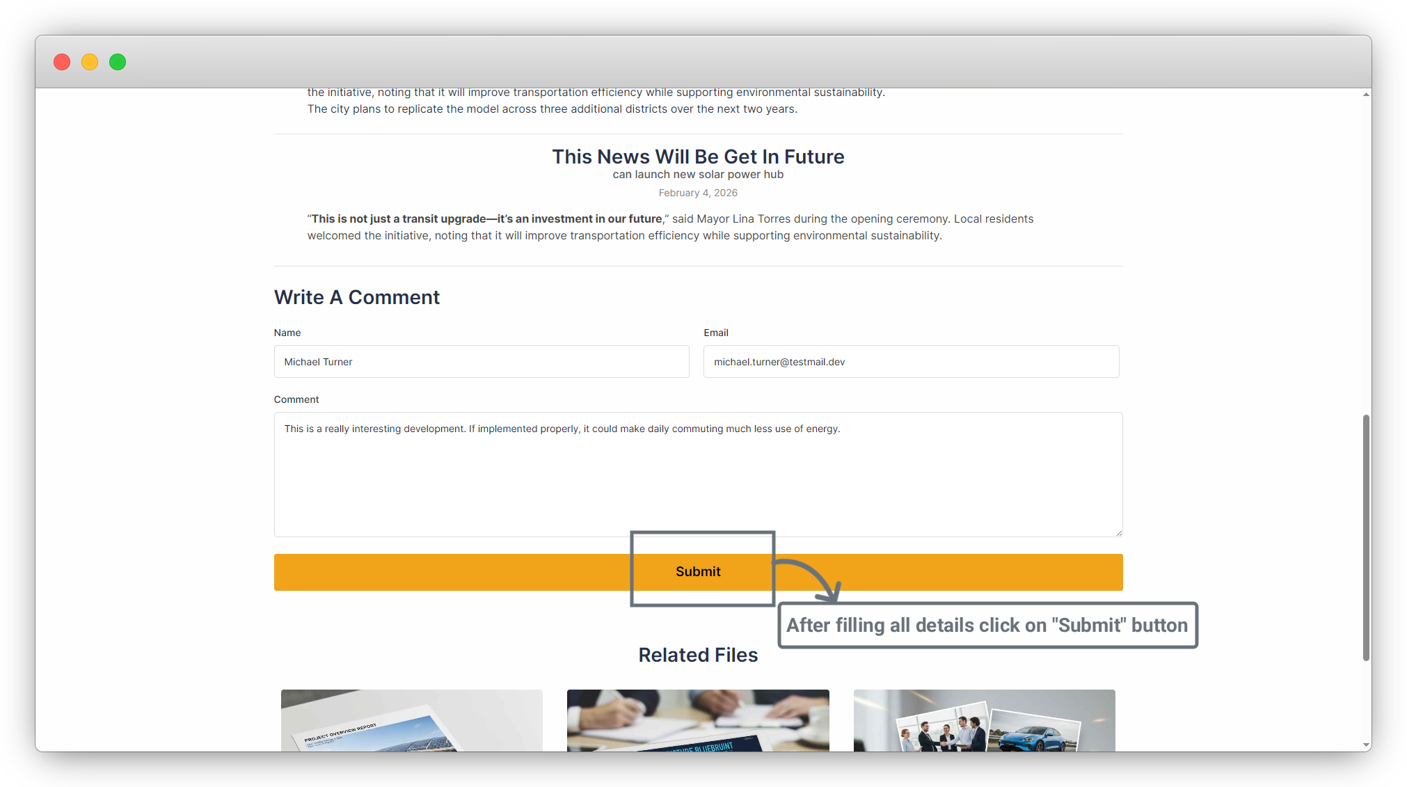 3. Now go to the News Details page on the frontend. You will see a comment form with three fields: Name, Email, and Comment, as shown in the screenshot below.