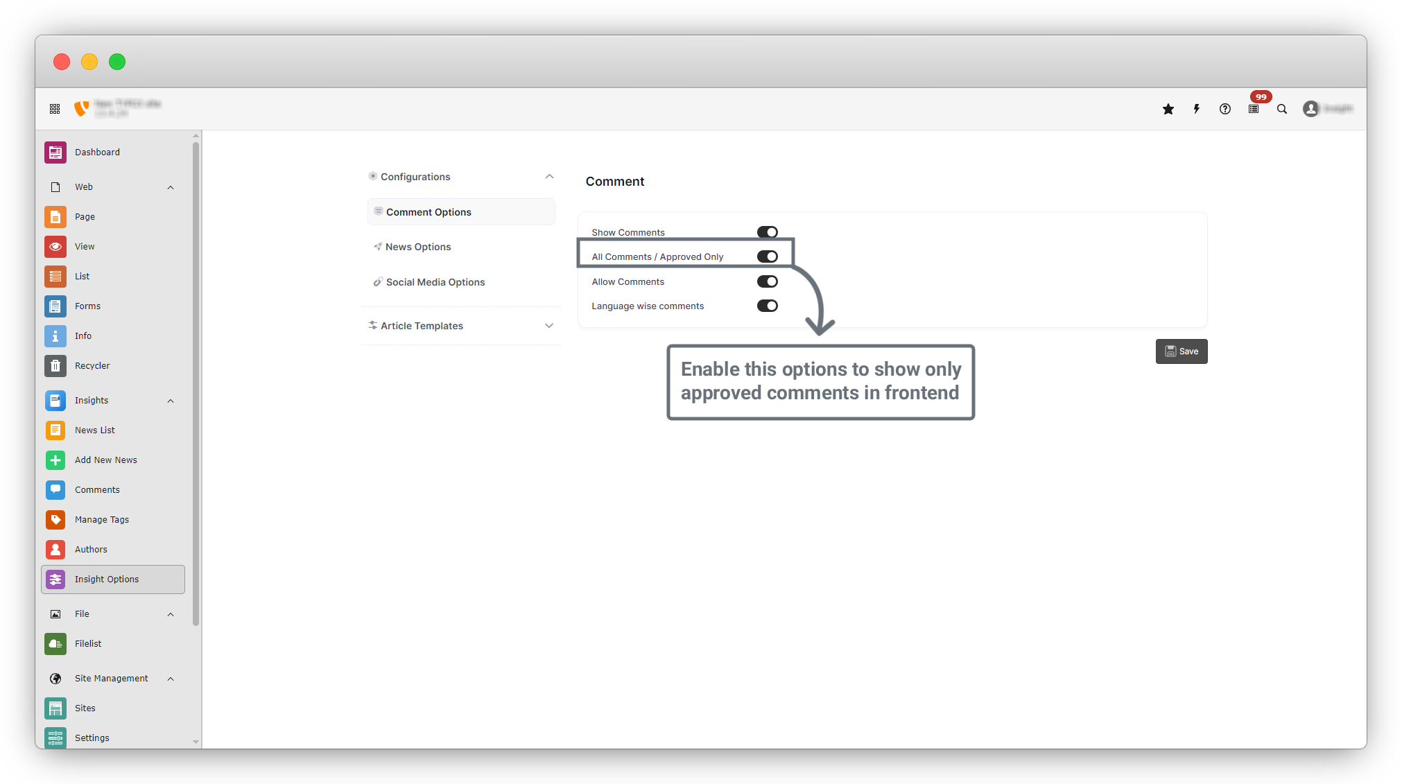 9. If you want to display only approved comments, enable the child option “All Comments / Approved Only” under Show Comments, then click the Save button.