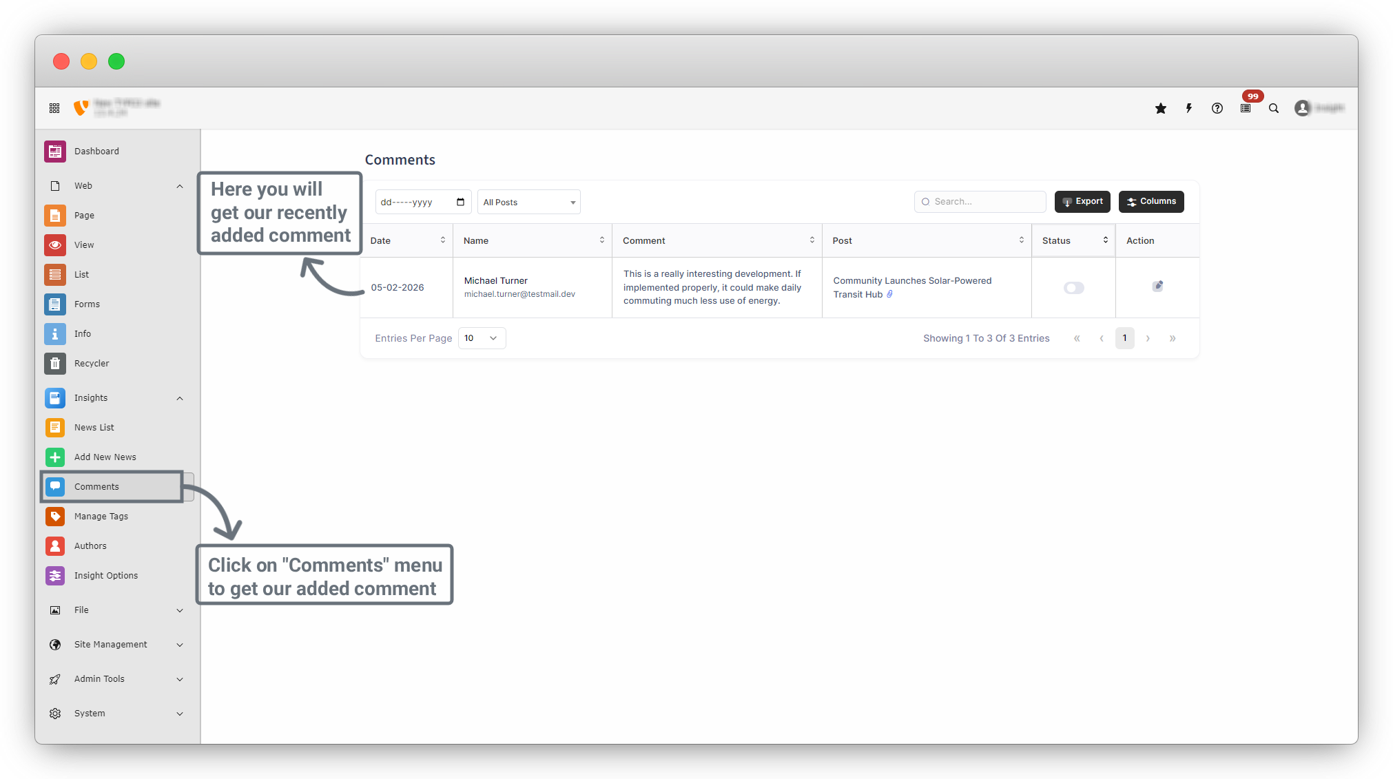 11. To approve the comment, go to Insights > Comments from the sidebar menu. You will see a list of all comments, including the recently added one.