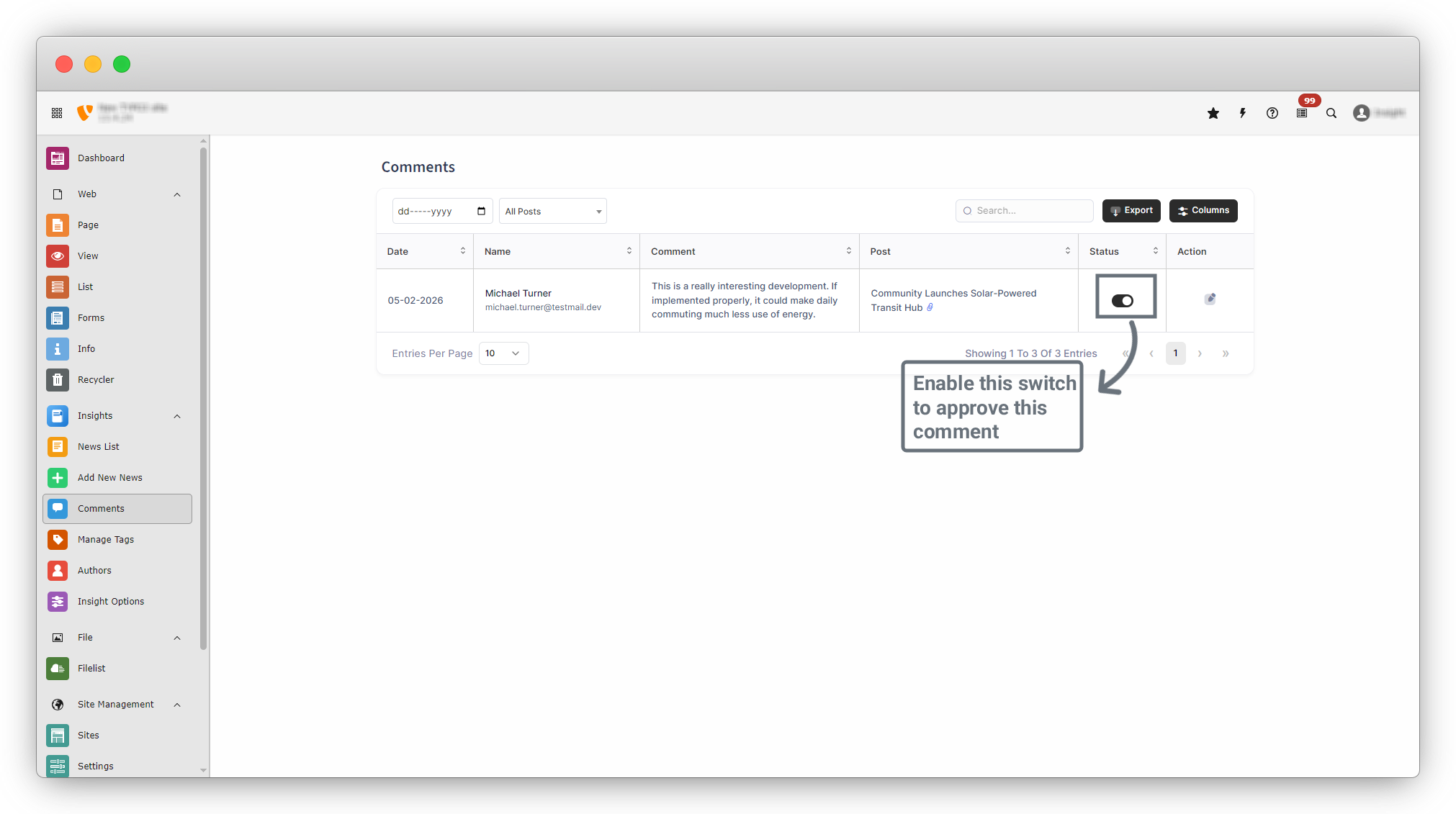 12. In the comment list, locate the Status column. Use the toggle switch in the Status column to approve the comment. Once enabled, the comment is approved.