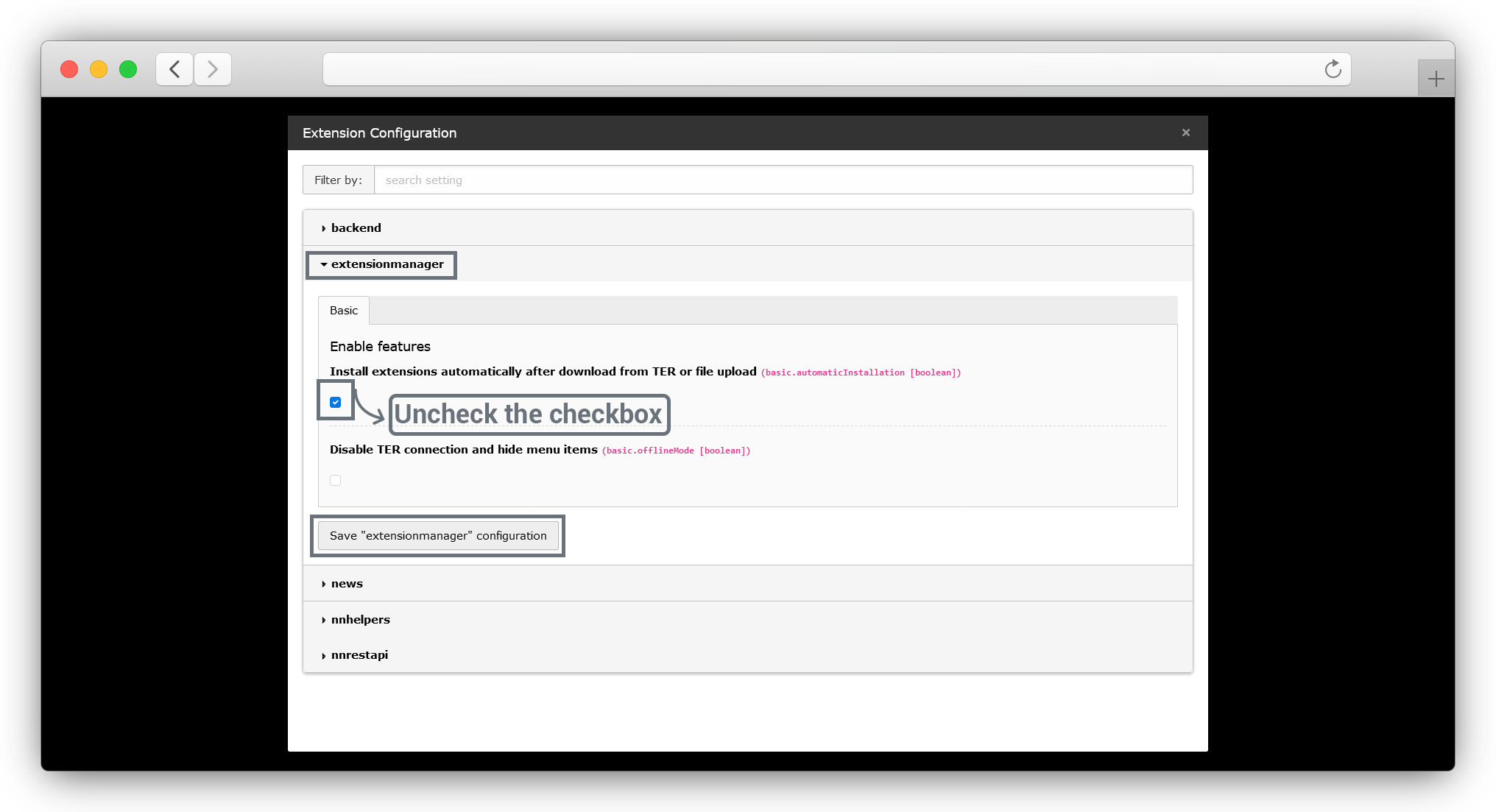 Then the pop-up will open as seen screenshot below, in that popup go to the extensionmanager > Install extensions automatically after download from TER or file upload (basic.automatic Installation [boolean])) and uncheck the checkbox & click on the Save “extensionmanager” configuration button