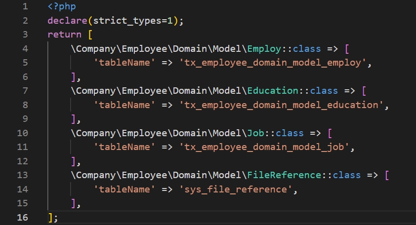 1. Let’s establish the connection between the model and the database table by adding the below code in the file Classes.php. The file path is employeeConfigurationExtbasePersistenceClasses.php