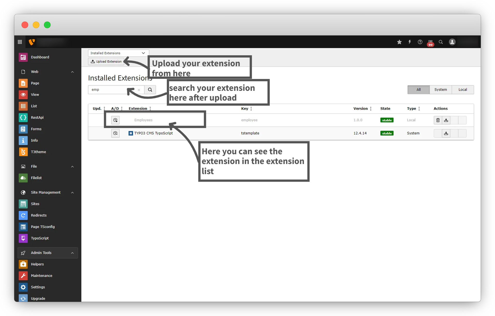 After completing the above steps, you will be able to find your extension in the extension list if you already have created the extension in your TYPO3 website. But if you have created it in the local TYPO3 setup then you will have to upload the extension after completing above steps and you will see your extension into the extension list as seen in the screenshot below: