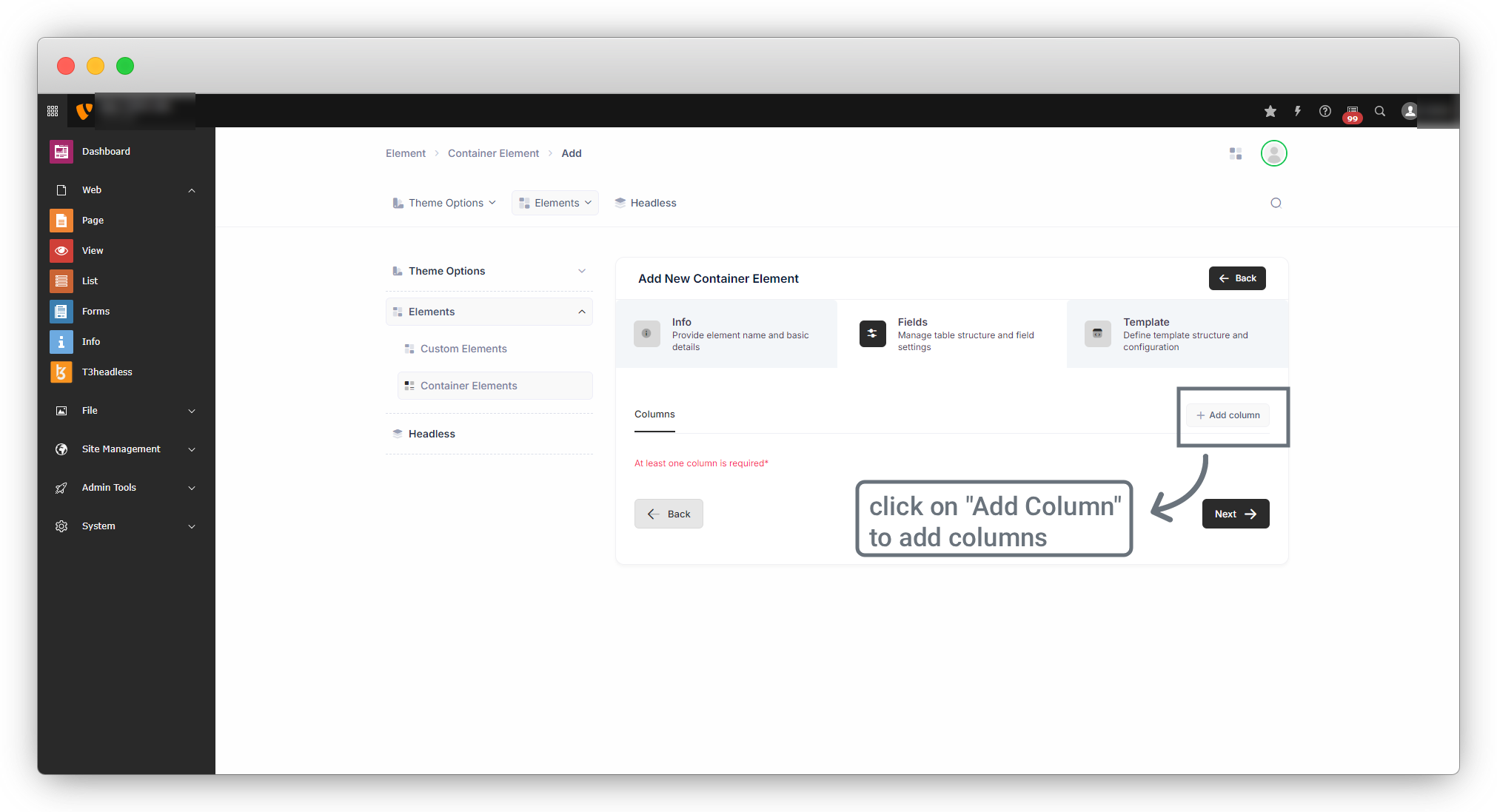 1. Add Element: Create a container element by clicking on the button “New Container Element”.